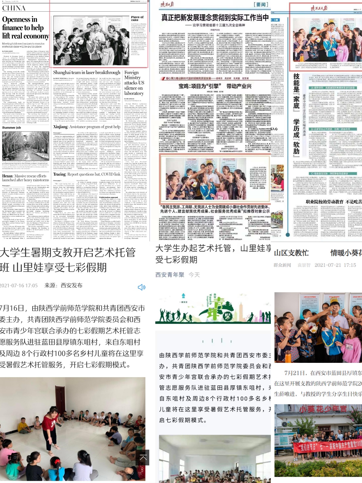 数学与统计学院青年扶志实践队受到社会媒体的高度关注,截止目前为止,受到中国日报(CHINA DAILY)英文版、陕西日报、陕西工人报、西安发布、西安青年聚、群众新闻等媒体报道。