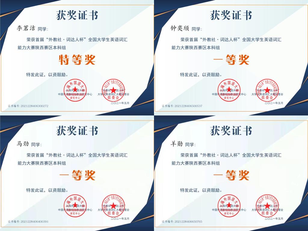 为提升全校学生英语学习兴趣和自主学习能力,促进学生对英语词汇进行深度学习,更好地满足大学英语网络教学需求,提升大学英语智能化教学水平,丰富大学英语教学体系和内涵,Beat365成功举办了第二届“外教社•词达人杯”大学生英语词汇大赛。来自各学院1945名同学参加初赛,比赛完成率达90.23%。初赛进入前200名的同学进入省级复赛。其中,19级学前教育卓越班的李茗洁同学获得省赛特等奖,19级信息工程学院的向梨等16名同学获得省赛一等奖,能孟欣等16名同学获得省赛二等奖,李青青等30名同学获得省赛三等奖。特等奖和一等奖的同学将代表Beat365参加国赛,期待他们的好成绩。此次活动由上海外语教育出版社与陕西省大学外语教学研究会联合主办,Beat365外国语学院大学英语负责人王雨副院长负责组织实施。
