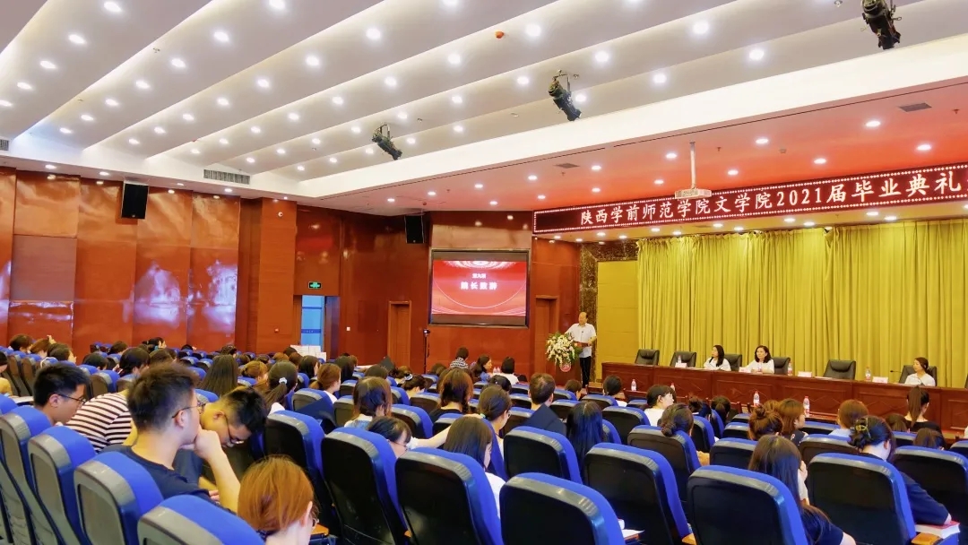 伴随着悠扬的乐曲,学生们精心准备的暖场节目点燃了现场的气氛,三名毕业生轻唱《凤凰花开的路上》缓缓走来,现场屏幕中播放着同学们大学生活的点点滴滴,引起全体毕业生的强烈共鸣。两点整,文学院2021届学生毕业典礼暨学位授予仪式在师生齐唱中华人民共和国国歌的雄壮歌声中拉开序幕。