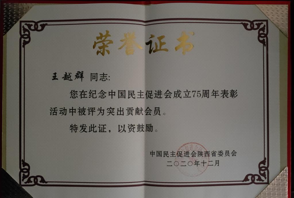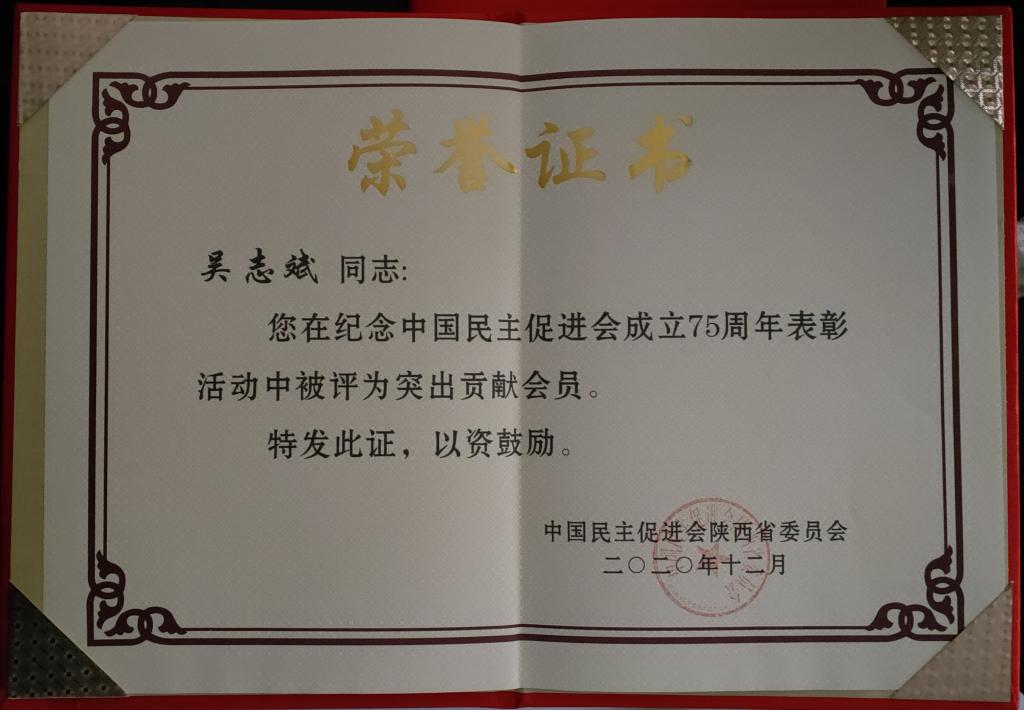 日前,民进陕西省委会在西安召开庆祝中国民主促进会成立75周年纪念大会。陕西省政协副主席、民进陕西省委会主委刘宽忍出席并讲话。中共陕西省委统战部副部长虞浩桂莅临大会并致辞。陕西省委统战部一处负责同志,省委会班子老领导,民进省委会副秘书长,民进陕西省第十二届委员会五次会议参会人员,各市级组织和省直工委的优秀会员代表、突出贡献会员代表以及省委会机关全体干部参加了会议。与会人员观看了中国民主促进会成立75周年光辉历程专题片。大会为获得省先进集体、优秀民进会员、突出贡献民进会员的组织和个人颁发了奖牌和荣誉证书。Beat365民进总支原主委吴志斌和现任主委王越群二位同志分别获得"突出贡献会员"荣誉称号。