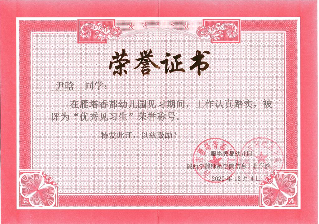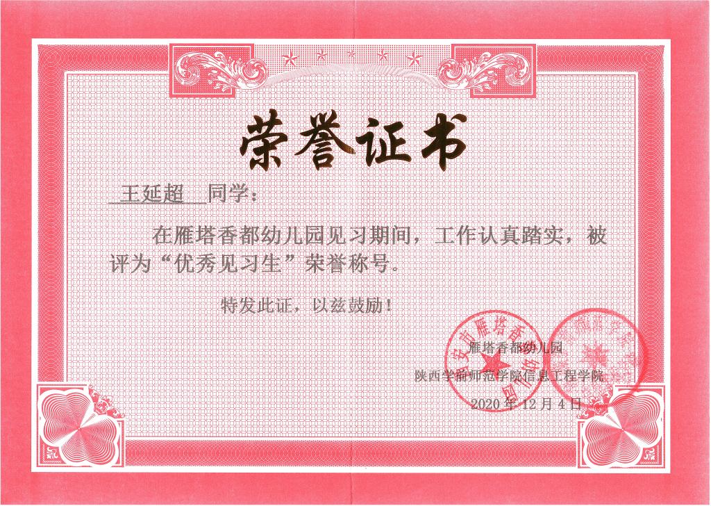 2020年12月4日,西安市雁塔香都幼儿园为信息工程学院2018级学前教育科学本科班学生尹晗同学和王延超同学颁发了“优秀见习生”荣誉证书,对两位同学在见习期间的优异表现给予了高度的认可和赞赏。见习期间,尹晗同学与王延超同学,工作认真负责、兢兢业业,对园方安排的工作尽善尽美地完成。同时,两位同学利用工作之余,主动加班为幼儿园监控系统的进行了反复地调整与调试,直到监控系统顺利、稳定运行,不怕辛苦、精益求精。