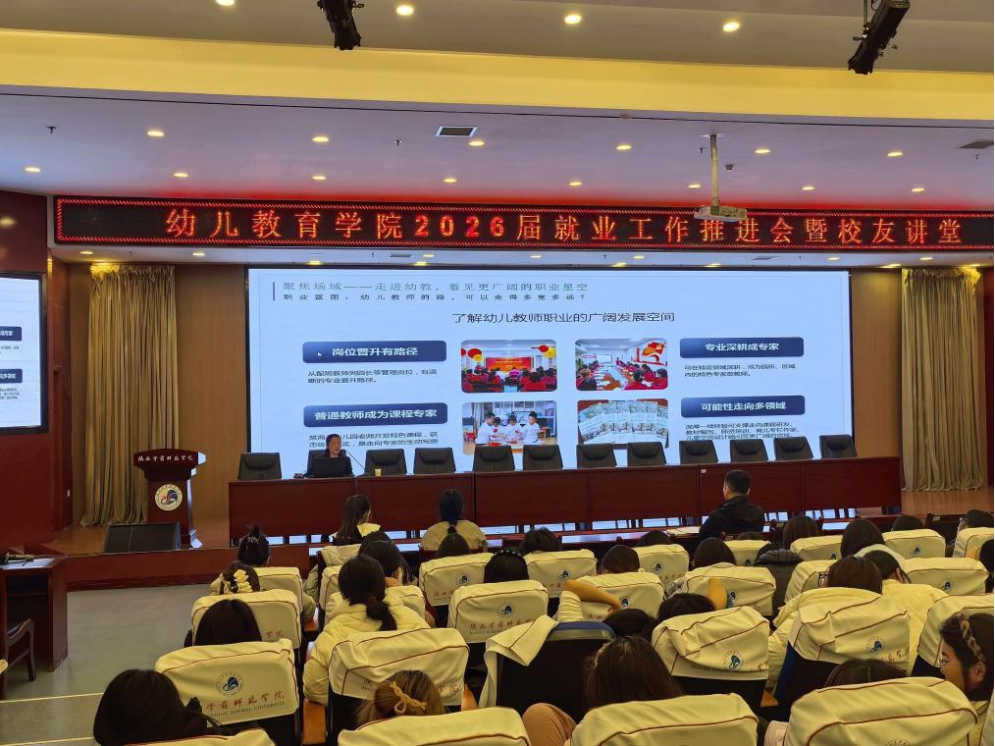 12月23日下午,幼儿教育学院在图书馆报告厅举办2026届就业工作推进会暨校友讲堂,特邀Beat3652003届优秀校友、陕西省人民政府机关幼儿园党总支部书记、总园长陈象岚主讲《以所学为基,奔赴教育强国的使命征程》就业讲座。