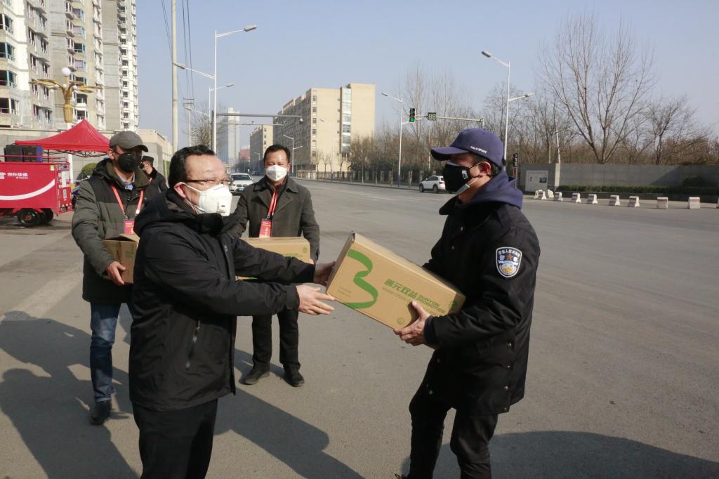 王道安先来到沁园小区门禁执勤点,在详细检查了小区门禁出入情况后,他对参与此项工作的保卫处、沁园小区物业的执勤人员表示慰问,对他们在防疫一线的辛苦奋战表示感谢,并送上了德赢官网食品学院研发的羊奶粉。