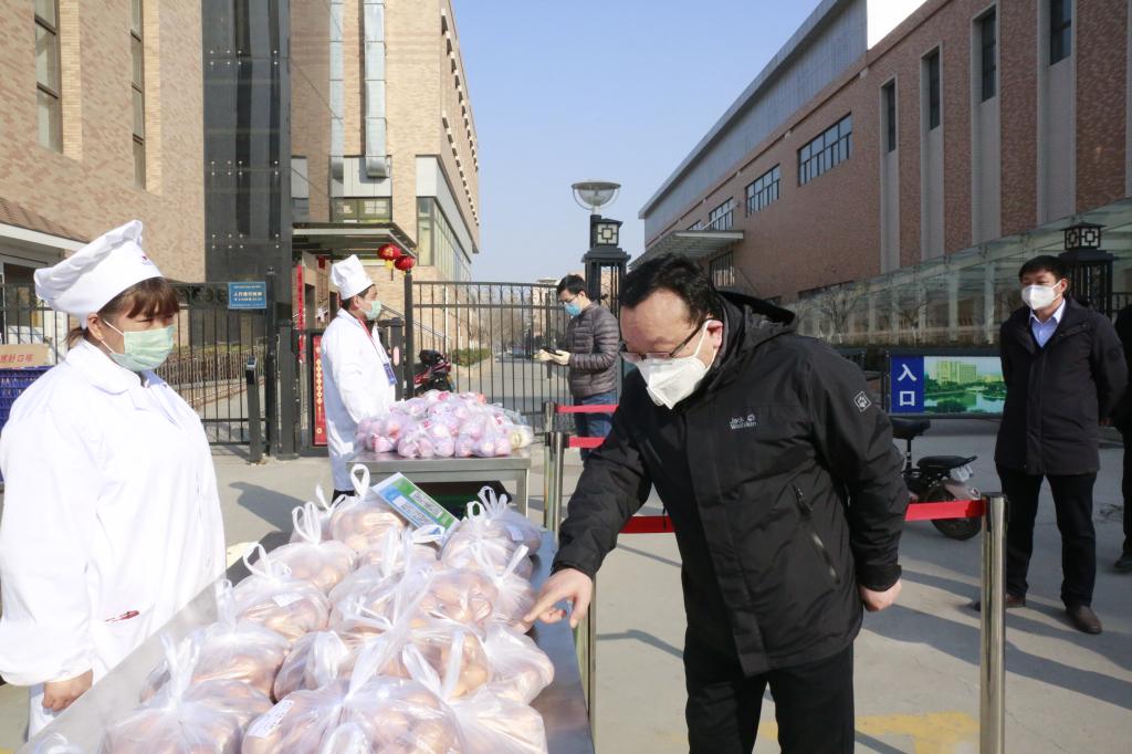 来到后勤集团“零利润”蔬菜供应点,王道安对正在分装、售卖蔬菜、鸡蛋、水果的餐厅工作人员表示慰问。他强调,越保障,越顺畅,关键时期后勤保障工作一定要跟上,希望大家继续保持高涨的工作热情,通过高质量的服务拉近与群众的距离,同时要保持工作距离,减少交叉感染,保护好自身安全,让学校、让师生放心。