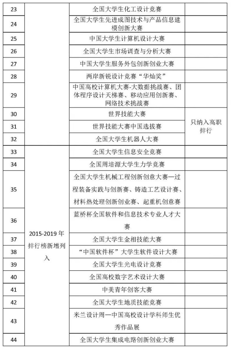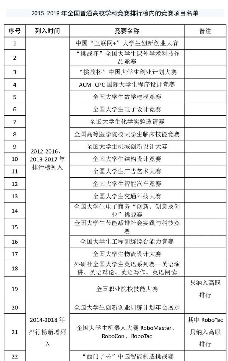 自2017年12月14日在杭州首次发布2012-2016年我国普通高校学科竞赛结果以来,中国高等教育学会《高校竞赛评估与管理体系研究》专家工作组已连续3年发布榜单,在社会上引起广泛关注。2020年1月3日,全国高校竞赛排行榜专家委员会对2015-2019年我国普通高校学科竞赛排行榜的竞赛项目进行了调整,新增12项竞赛纳入榜单,另有2项竞赛退出榜单。