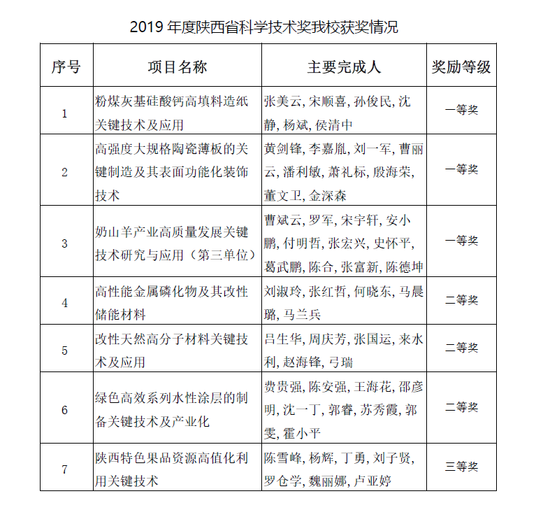 德赢官网共有7项科研成果获得奖励,其中一等奖3项,二等奖3项,三等奖1项。德赢官网张美云教授等完成的“粉煤灰基硅酸钙高填料造纸关键技术及应用”,黄剑锋教授等完成的“高强度大规格陶瓷薄板的关键制造及其表面功能化装饰技术”,陈合教授等参与完成的“奶山羊产业高质量发展关键技术研究与应用”,成果获得陕西省科学技术奖一等奖,“高性能金属磷化物及其改性储能材料”等3项成果获得二等奖,“陕西特色果品资源高值化利用关键技术”等1项成果获得三等奖。