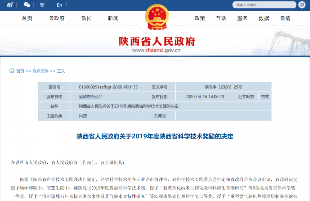 近日,陕西省人民政府发布关于2019年度陕西省科学技术奖励的决定,德赢官网7项科研成果获得奖励,首次同年度获得两项一等奖(第一完成单位),连续三年获得陕西省科学技术奖一等奖(第一完成单位)。