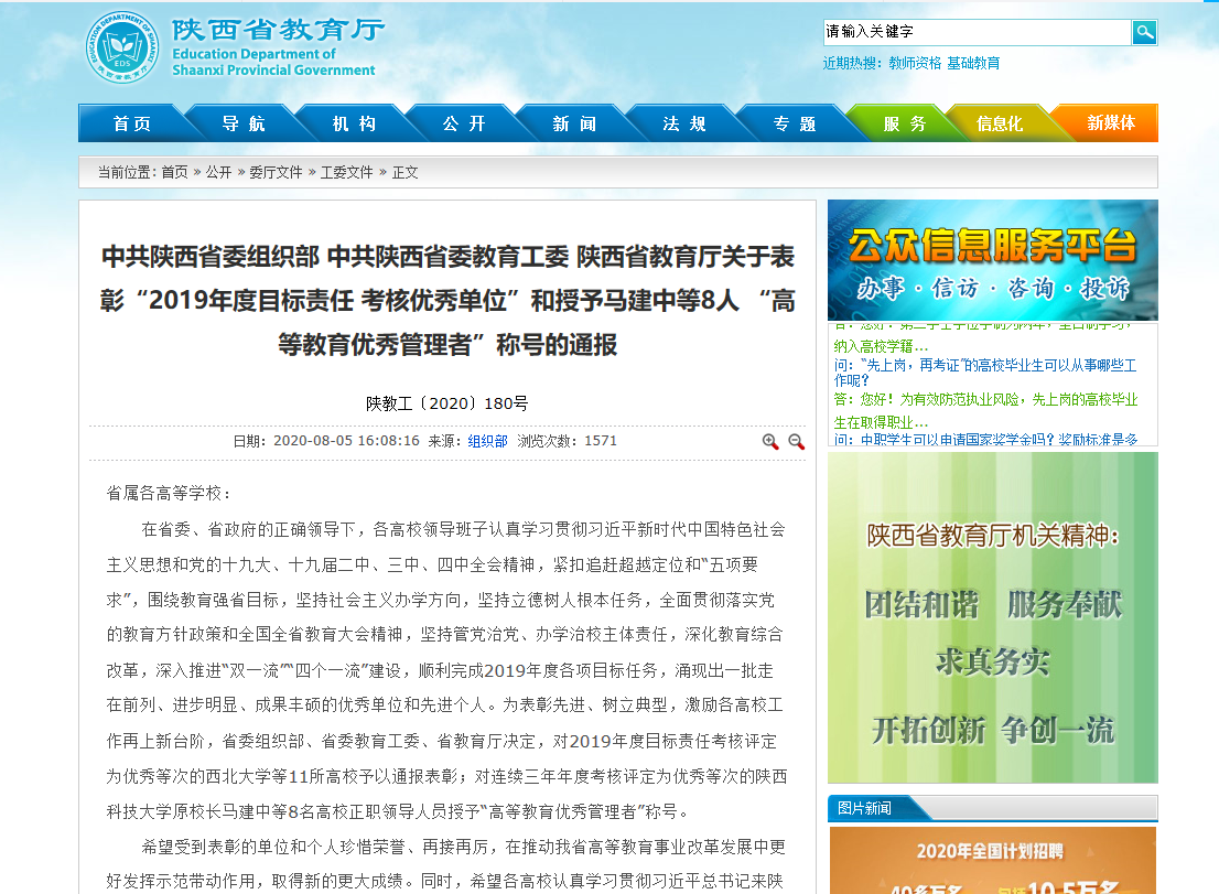 日前,中共陕西省委组织部、省委教育工委、省教育厅发布通报表彰,德赢官网等11所省属高校荣获“2019年度高校目标责任考核优秀单位” ;并对连续三年年度考核评定为优秀等次的德赢官网Vwin原校长马建中等8名高校正职领导人员授予“高等教育优秀管理者”称号。据悉,此次仅有三家连续四年获“高校目标责任考核优秀单位”,德赢官网更是其中唯一一所主要领导先后获得“高等教育杰出管理者”“高等教育优秀管理者”称号的高校。
