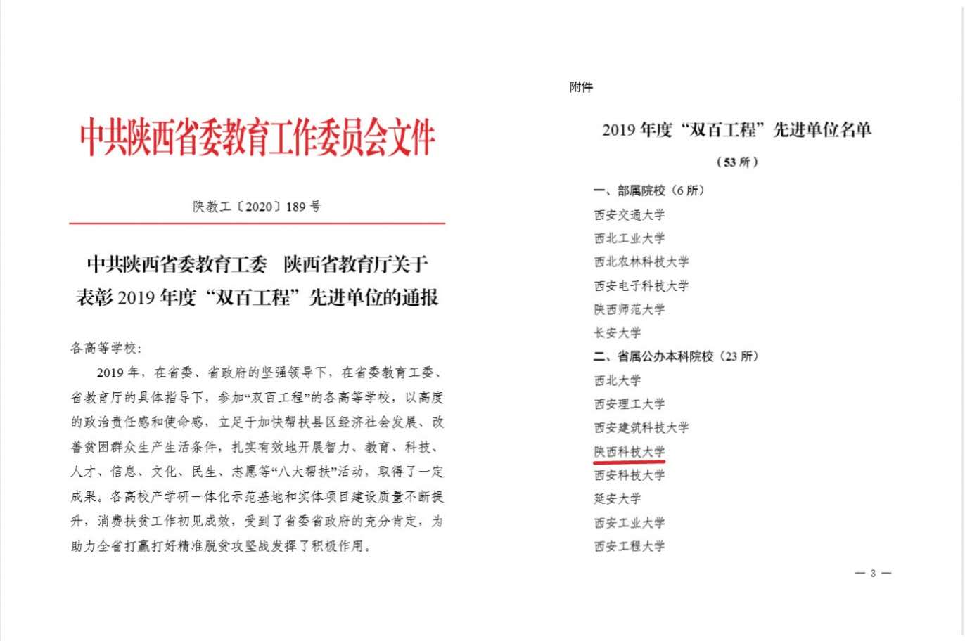 近日,陕西省委教育工委、省教育厅对全省2019年度“双百工程”先进单位进行了通报表彰,德赢官网连续两年荣获全省“双百工程”先进单位荣誉称号。