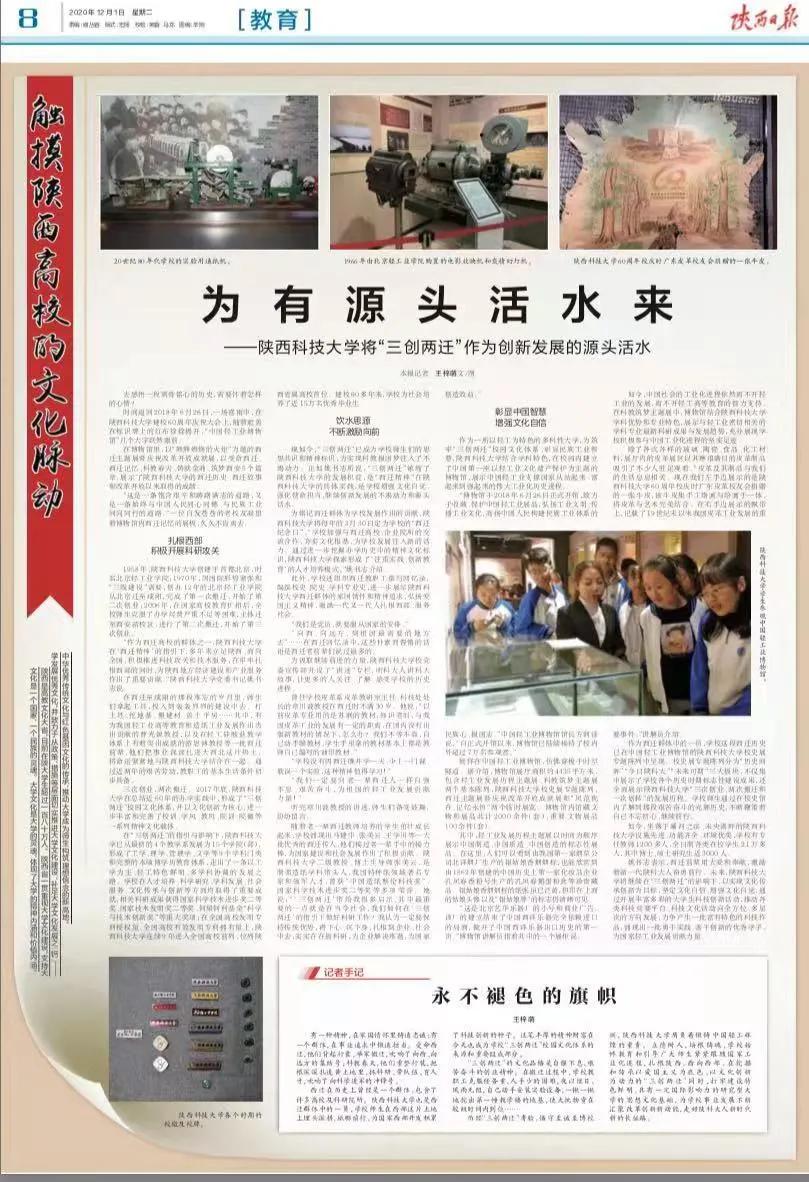 12月1日,《陕西日报》八版以《为有源头活水来——德赢官网Vwin将“三创两迁”作为创新发展的源头活水》为题,整版报道德赢官网西迁历史、西迁故事和近年来取得的成绩。德赢官网Vwin作为“西迁群体”之一,在六十多年的发展历程中,历经“三次创业、两次搬迁、一次划转”的奋斗与辉煌,秉承以“自强不息、艰苦奋斗的创业精神,求实创新、锐意进取的科学精神和扎根西部、服务社会的奉献精神”为内涵的“三创两迁”精神,培养出一批勇于实践、善于创新的优秀学子,为国家建设和社会发展做出了重要贡献。全文转载如下: