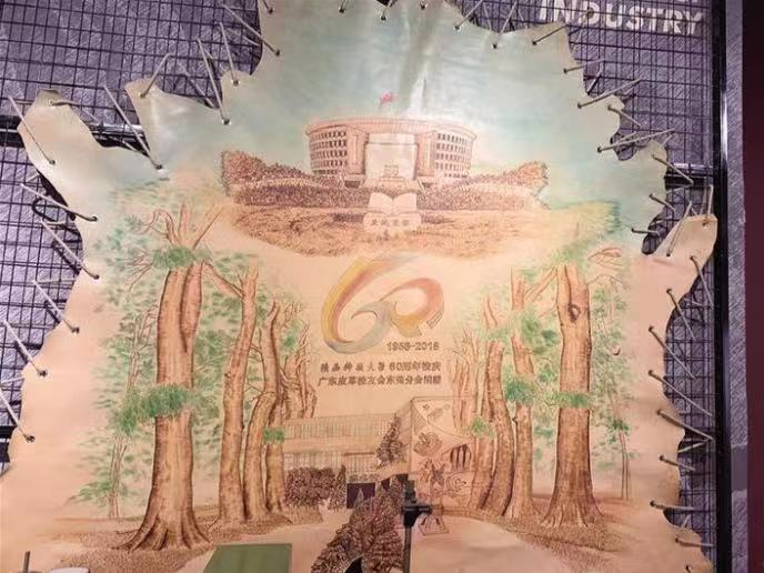 学校60周年校庆时,广东皮革校友会捐赠的一整张牛皮上手工烙皮革画