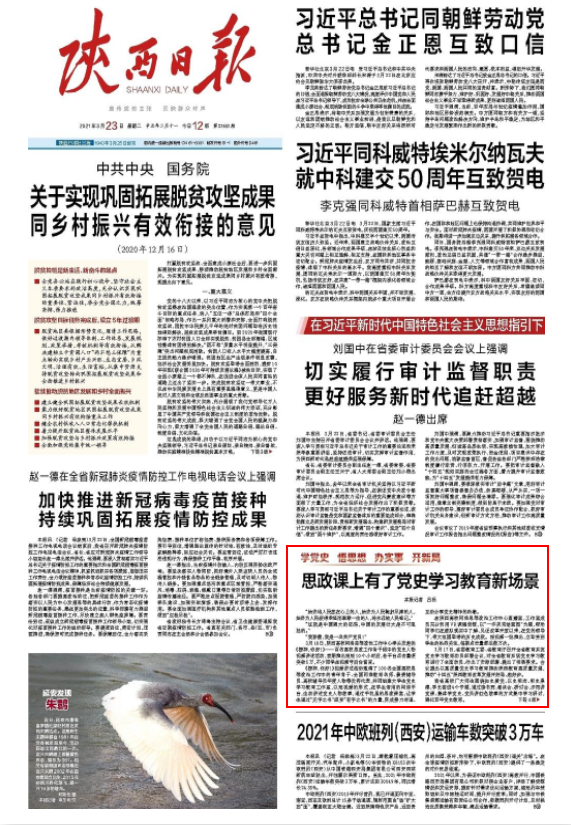 3月23日,《陕西日报》头版以《思政课上有了党史学习教育新场景》为题报道我省高校推进党史学习教育工作新举措新成效,对德赢官网承建的陕西高校网络思想政治工作中心牵头发起的《榜样,你好!》——百名高校思政工作骨干眼中的党史人物视频讲述活动进行了介绍。