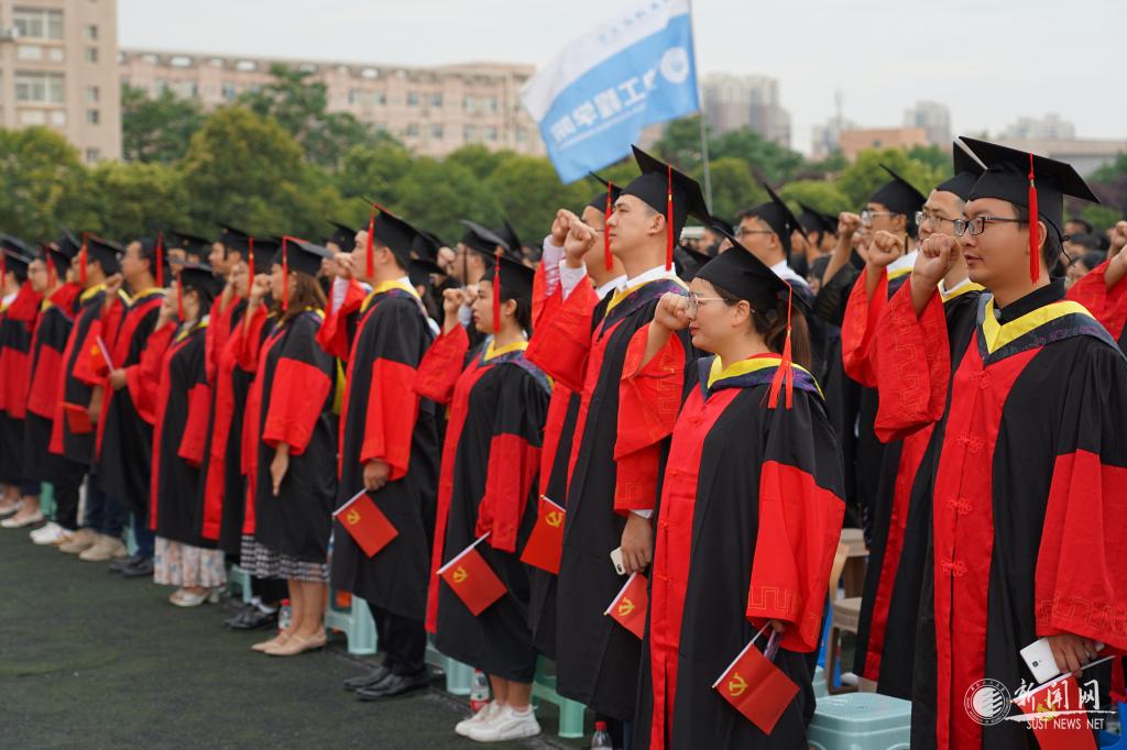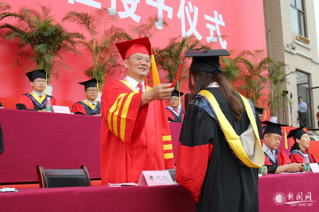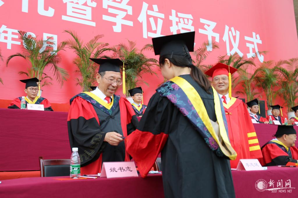 校领导为获得博士学位的32名毕业生(包括国际博士研究生)代表、学士学位的151名毕业生代表一一正冠拨穗,并颁授学位证书。其后,全体毕业生郑重宣誓“今日我以科大为荣,明日科大以我为荣!”