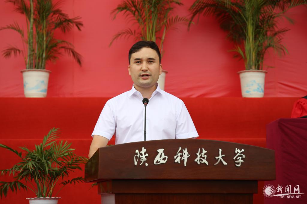 毕业生代表、经济与管理学院工商管理171班学生阿布都沙拉木·艾比布拉同学代表2021届全体毕业生向辛勤培养自己的母校道别、向孜孜不倦教导自己的老师道别、向朝夕相处的同窗道别、向这段不能忘怀的岁月道别,并祝愿母校明天会更好。他2017年响应国家“双创”号召,休学回到家乡吐鲁番创业,如今公司发展势头良好,年销售额千万元以上,这一切都离不开党和政府的支持,离不开母校的鼎力相助。