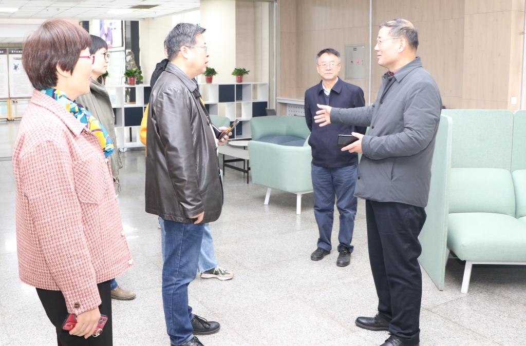 校长李志健(右一)在休闲阅读区谈图书馆建设发展
