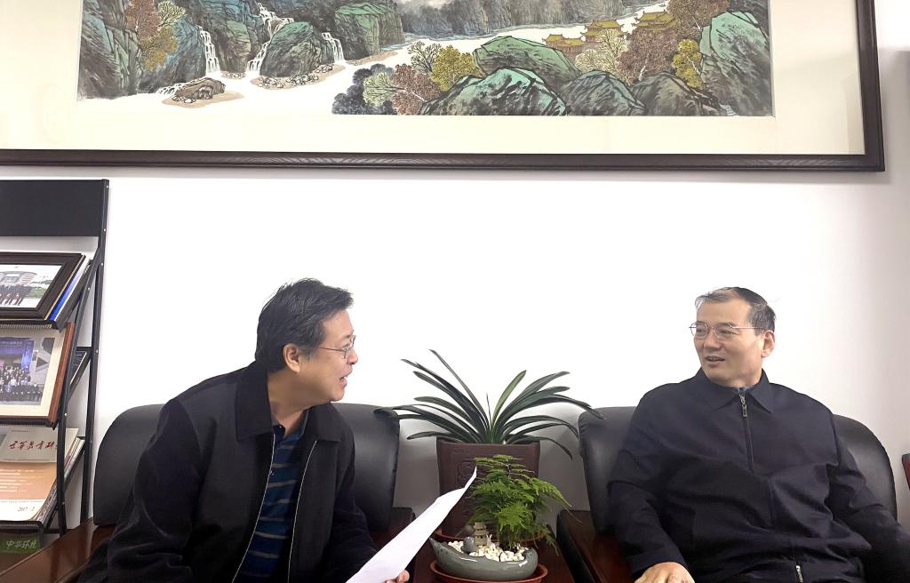 校长李志健(右)在办公室接受图书馆馆长王海刚采访