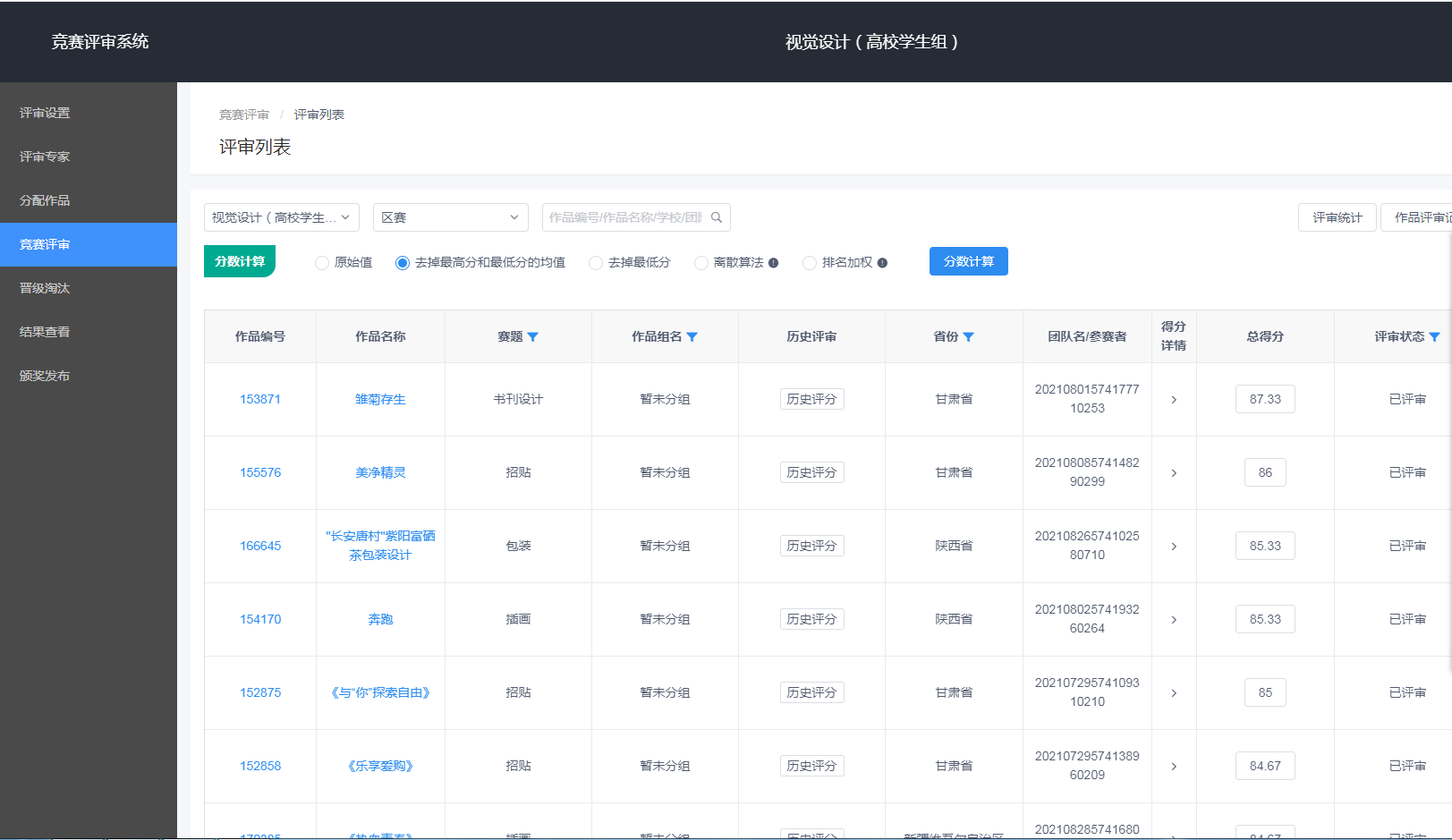 10月6日,根据《第七届两岸新锐设计竞赛·华灿奖评审工作方案》,华灿奖西北赛区组委会从华灿专家库里遴选出25位专家进行视觉设计类、数字多媒体设计类、产品设计类、工艺美术类、空间环境类等5个类别的评选。评审前,西北赛区组委会主任李志健对这25位评委资格进行了审定。经过25位评委(其中本赛区外评委16人,占比64%;全国各类教指委委员评委10人,占比40%)近十天的严格评审,共评选出555件作品晋级全国赛,西北赛区组委会按照华灿奖每个组别15%(一等奖1%、二等奖4%、三等奖10%)的获奖比例,评审出本赛区各组别一、二、三等奖的获奖,并上报华灿奖全国组委会。