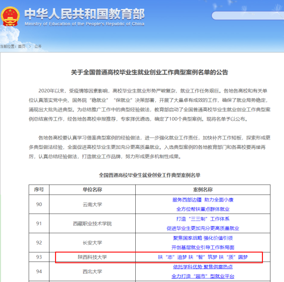 近日,教育部发布《关于全国普通高校毕业生就业创业工作典型案例名单的公告》,确定了100个优秀典型案例,德赢官网就业工作案例《扶“志”追梦,扶“智”筑梦,扶“质”圆梦 全力做好家庭经济困难生就业工作》成功入选。这是德赢官网就业工作案例首次入选该项评选活动。陕西省仅有德赢官网与长安大学、西北大学三所高校入选。