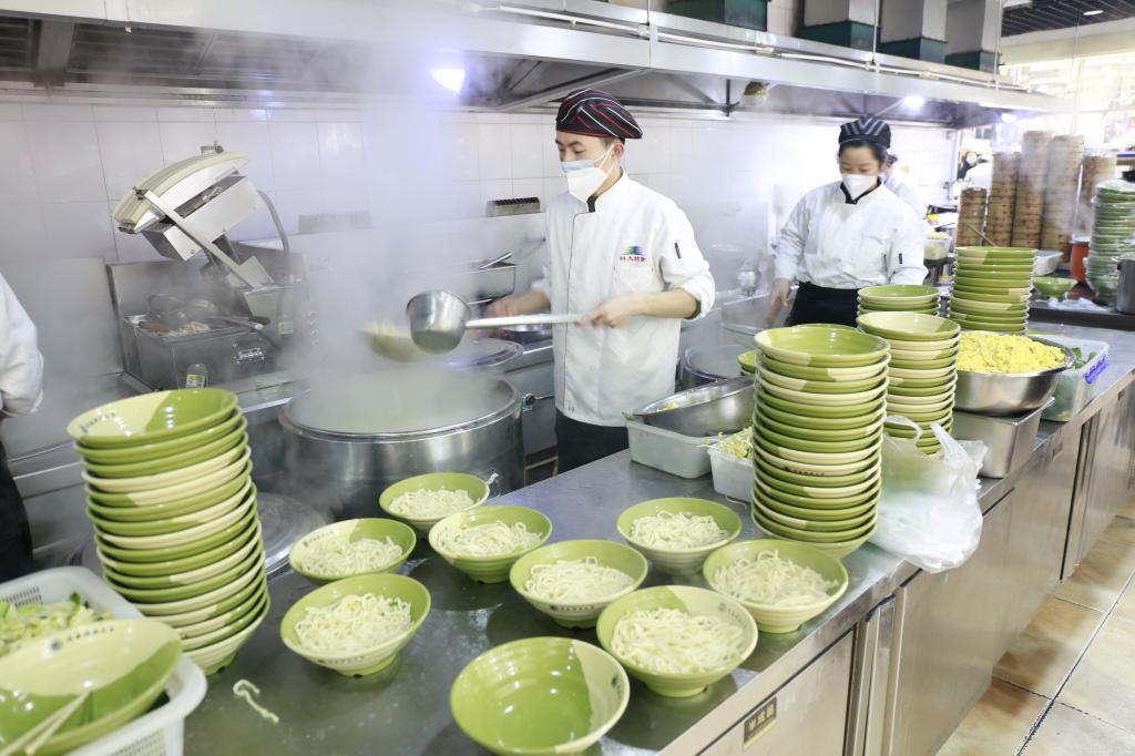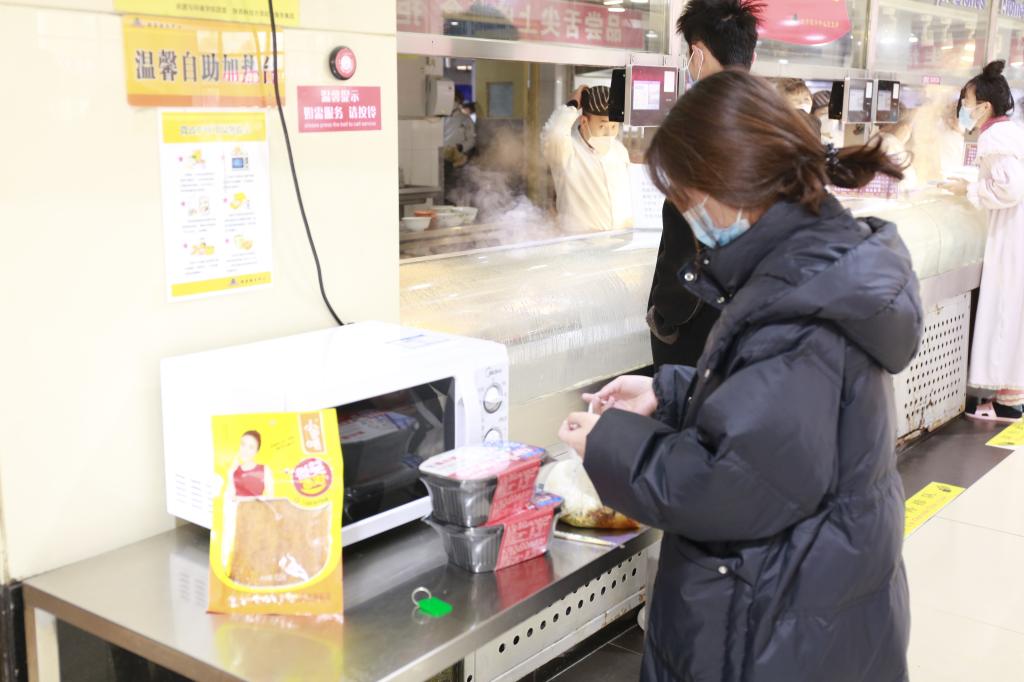 针对学生反映问题,当日提、次日改。29日,各餐厅快餐类饭菜下面一律加上了保温毯,有的菜品先用保鲜膜覆盖,然后再在上面盖上厚厚的棉被,各餐厅大堂还设置了微波炉,有效解决了饭菜不热的问题;30日,为了满足部分学生提到的想吃冒菜、香锅的需求,各餐厅烹制了炖菜、烩菜作为替代;31日,学生提出“馨园餐厅某档口鱼滑面中的鱼滑少”,餐厅经理及时调研后勒令该档口及时整改;31日跨年夜,学校民族餐厅加班加点赶制出120个馕和香喷喷的羊肉,让少数民族学生能在隔离就餐期间享受家乡的美食。
