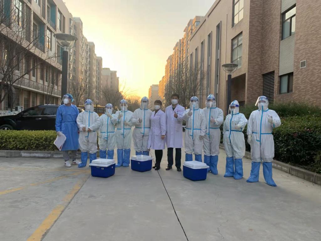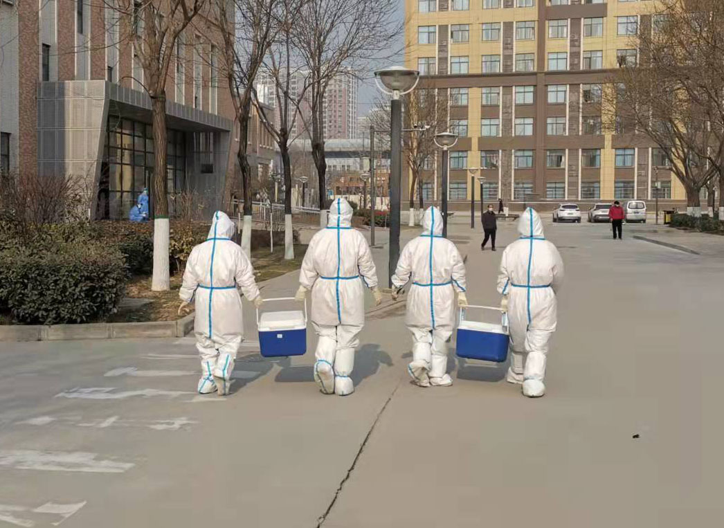 每日核酸采样工作在三个时空分别开展:第一组是全校21477名本科、研究生在校园南区文体馆采样,文体馆内设置了8个采样台,每个采样区中间设立2米安全距离,以安全警戒线隔开,16个学生公寓的学生分别在各自楼长、层长的带领下,错开时间,排一字长蛇队,从文体馆东门进入采样,做完后从西门离场,整个过程中避免学生聚集;第二组设在校园北区,为6000多名教职工及家属核酸采样区,设置了6个采样台,其中两个采样台专门服务没有一码通的老人、儿童。教工住宅区的24栋住宅楼也实行网格化管理,各楼错开时间段下楼检测,避免人员聚集;第三组是“攻坚组”——外出采样组,他们负责校内300多名隔离人员的核酸采样,工作危险系数最大,难度、强度最高。从12月22日起,他们每日背着沉重的采样箱、穿着闷热的防护服,出入于校外隔离点、沁园小区居家隔离户、校医院之间,不喝水、不上厕所,身上的防护服穿上后4个小时不脱下来,在室内时闷热的防护服捂得他们汗流浃背,到户外时防护服里产生大量的冷凝水渗透进外套、内衣。12月30日,外出采样的张新武医生脱下防护服,头发、全身的衣服已经完全被冷凝水湿透,就像刚从水里上岸一样,现场的同事都难过地流下眼泪。赵云龙医生身兼数职,一边负责采样数据信息系统的正常运行,一边还要将核酸检测样本的数据打包、转运至第三方检测机构,为了确保样本及时送达,他几乎每小时就要送一次核酸样本,有时候要忙到深夜,工作强度非常大。
