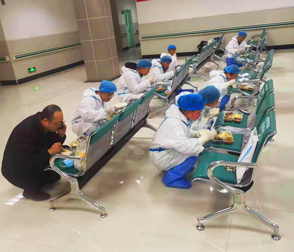最大的困难还是在于西安市每日下达的采样时间不确定,有时候是早上8点,有时候又从8点推迟到10点,有时候甚至推迟到下午3点,在准备过程中,全体工作人员要一直穿着防护服等待。第二个困难是学校医护人员数量不足,一人多岗,职责交叉,每天的工作时长都在14小时以上,由于工作强度太大,36名医护人员有的感冒、有的胃疼,但他们“轻伤不下火线”,没有1人请假。