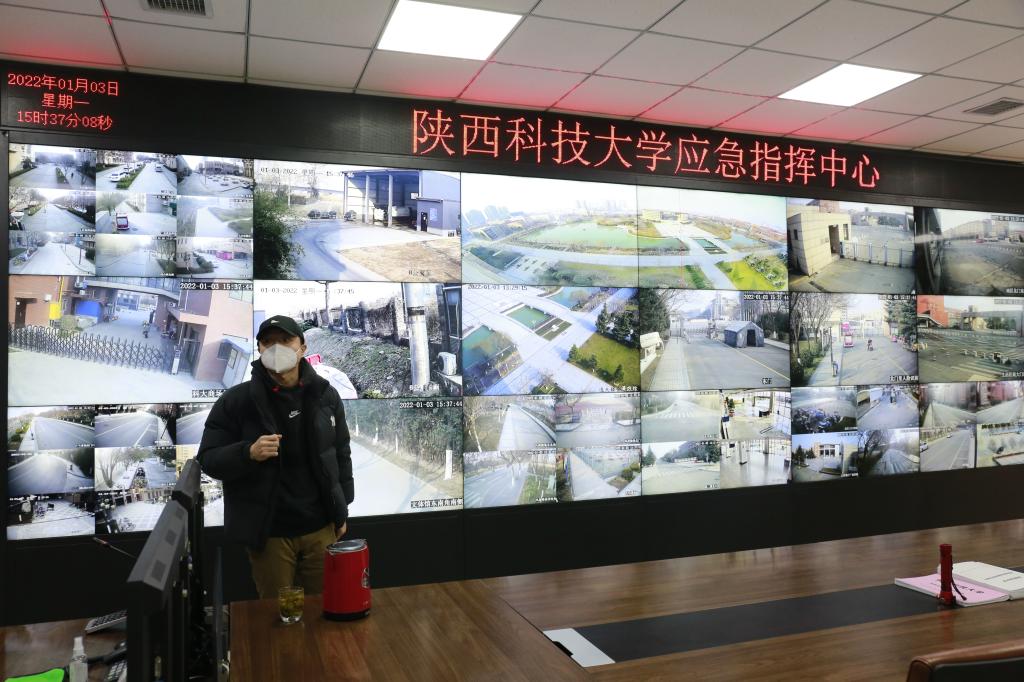 12月22日夜起,学校东西南北四个大门全部封闭,所有门禁点位24小时值守,严防死守、禁止出入。位于校园生活区西北角的陕科大应急指挥中心是学校的“天眼”,应急指挥系统连接着学校校园各处上千个监控摄像头,可以实时监控校园任意角落的安全状况,重点区域还布控有全景跟踪定位系统,监控人员24小时在这里值守、“一夫当关,万夫莫开”,把校园守护得如铁桶般坚固,只留生活区南门用于保障物资进入和垃圾清运车辆出入,所有校外运输车辆及物流人员持“两码一证”、进行防疫消杀后才可进入。