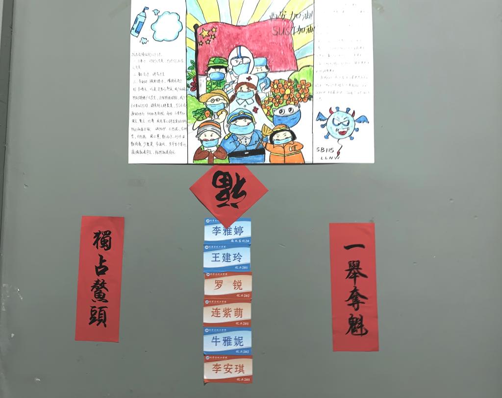 往年的元旦,同学们或是返家与家人团聚,或是和好友在外游玩,今年虽然活动范围受限,但老师、舍友围聚身边,这一家人却是整整齐齐,各个公寓专班的老师都在公寓内全力营造喜庆的过年氛围。“我们很早就开始着手,辅导员们跑遍了学校里的大小超市买红纸,最后学校里的红纸都快被我们公寓买完了,还有其他‘楼长’打来电话问我借红纸。”五公寓“楼长”安玲提起这些一心想着给五公寓354间宿舍贴满对联的辅导员忍俊不禁。