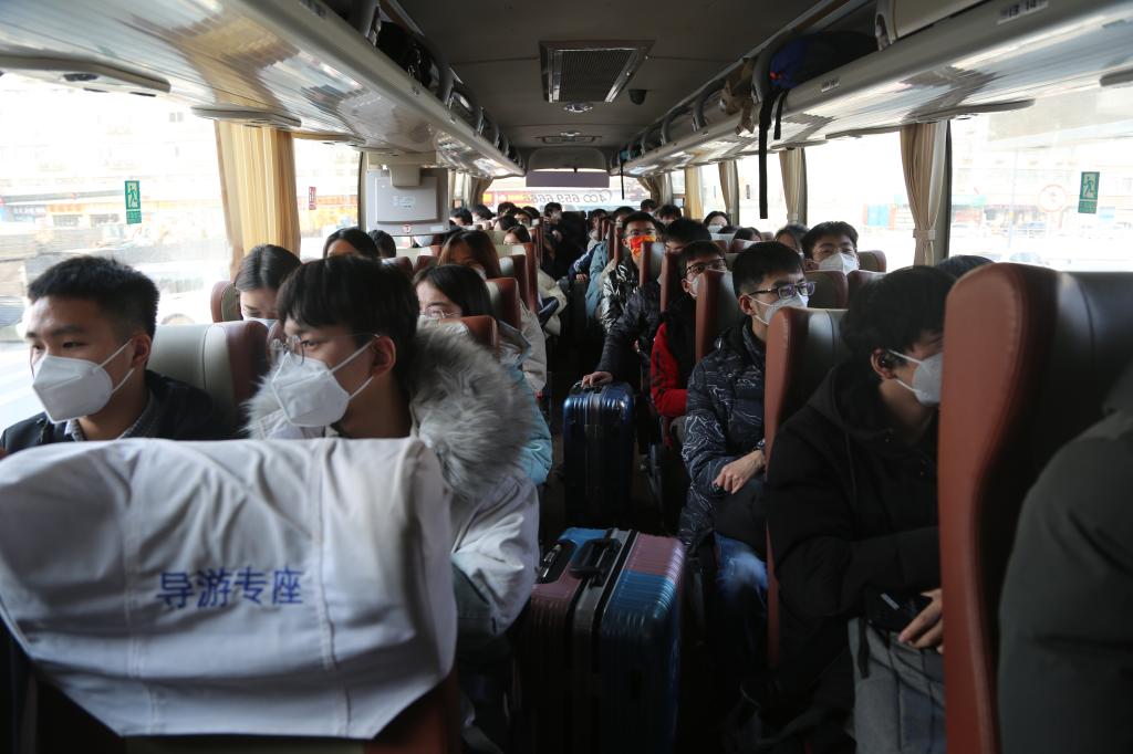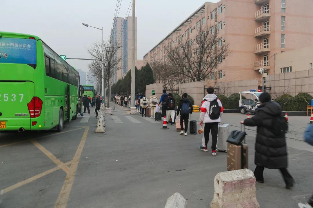 2022年1月16日晚22:00,第一批学生乘坐大巴车前往北客站,迈上回家路。