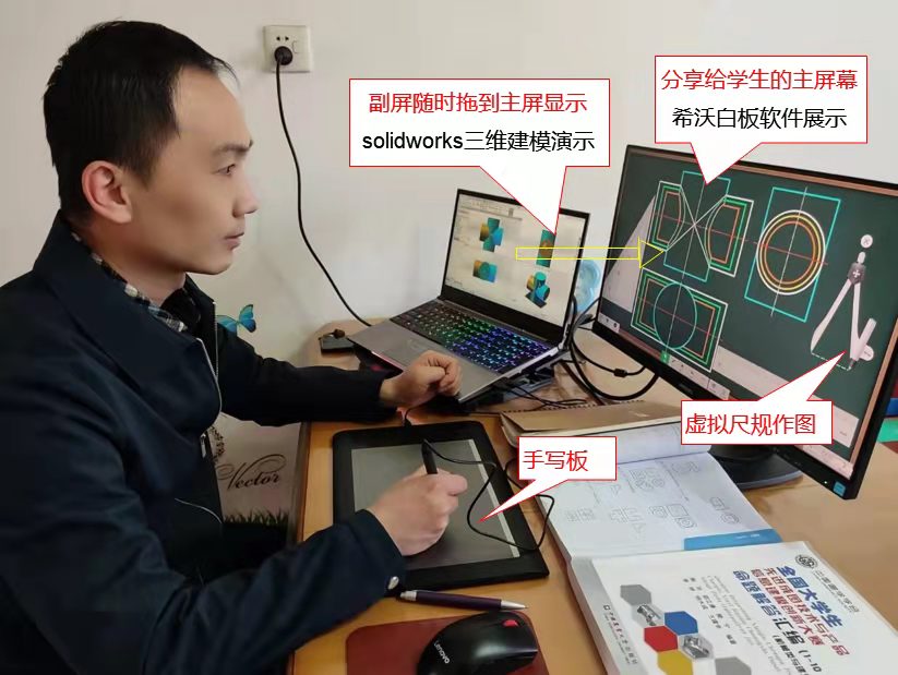 在为本科生讲授《工程制图》时,他采用希沃白板软件作为授课软件,以这块“黑板”作为背景,需要推导和演算的,就用手写板在“黑板”一笔笔写出“板书”;需要展示作图过程的,就用“虚拟尺规”软件,把作图过程一步步“画”出来;需要再现零件建模和装配全过程的,就把三维建模软件Solidworks从辅助屏拖到“黑板”上实操展示。