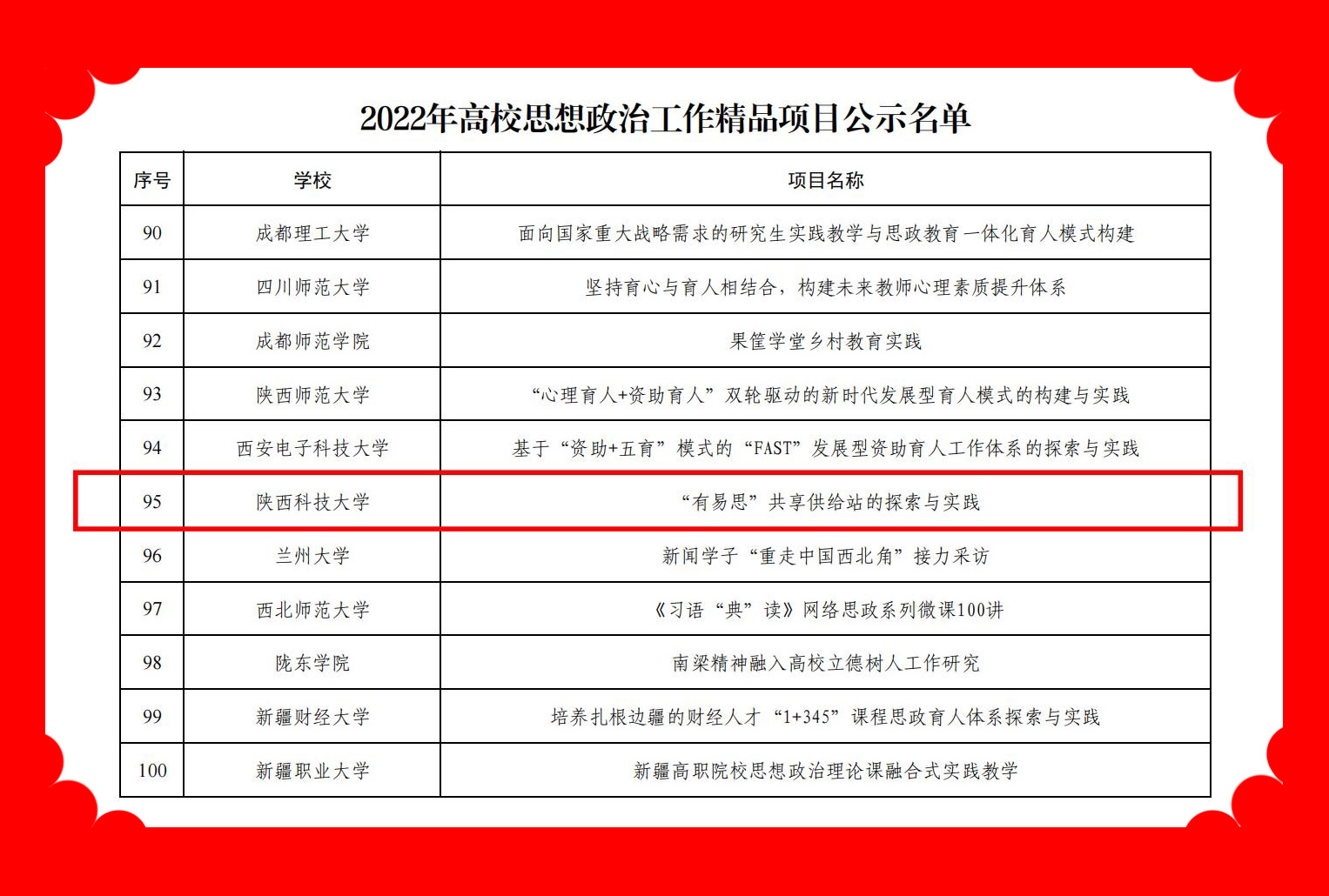 近日,教育部思想政治工作司公布了2022年度高校思想政治工作有关培育建设项目遴选结果,德赢官网姚书志教授主持的网络育人项目《“有易思”共享供给站的探索与实践》成功入选高校思想政治工作精品项目(全国100项,陕西仅有3所高校入选),实现德赢官网在高校思想政治工作领域顶级项目申报的新突破。