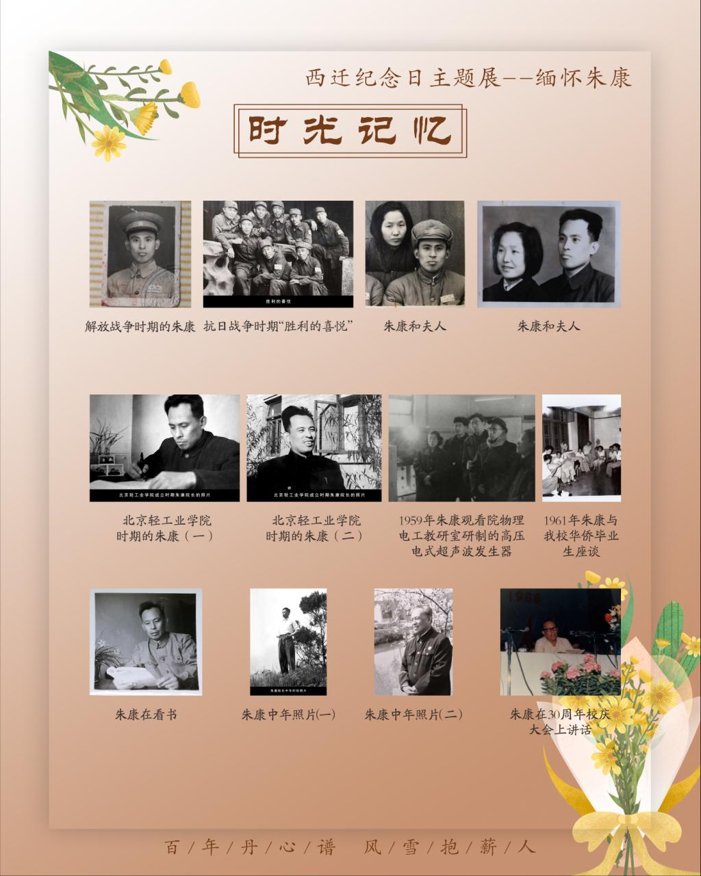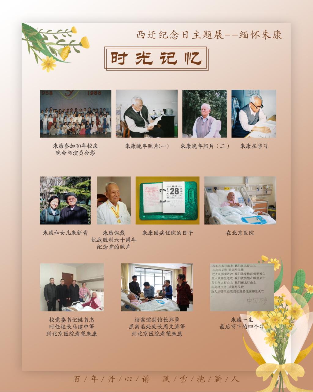 3月28日至4月8日,档案馆、图书馆、校史馆在图书馆二楼南大厅联合举办“西迁纪念日主题展——缅怀朱康”活动,主题展分展板部分和实物部分。展板分五个版块:序言、生平简介、时光记忆、北轻记忆及深切缅怀。实物部分展出了朱康捐赠给学校的二十余件珍贵实物档案。