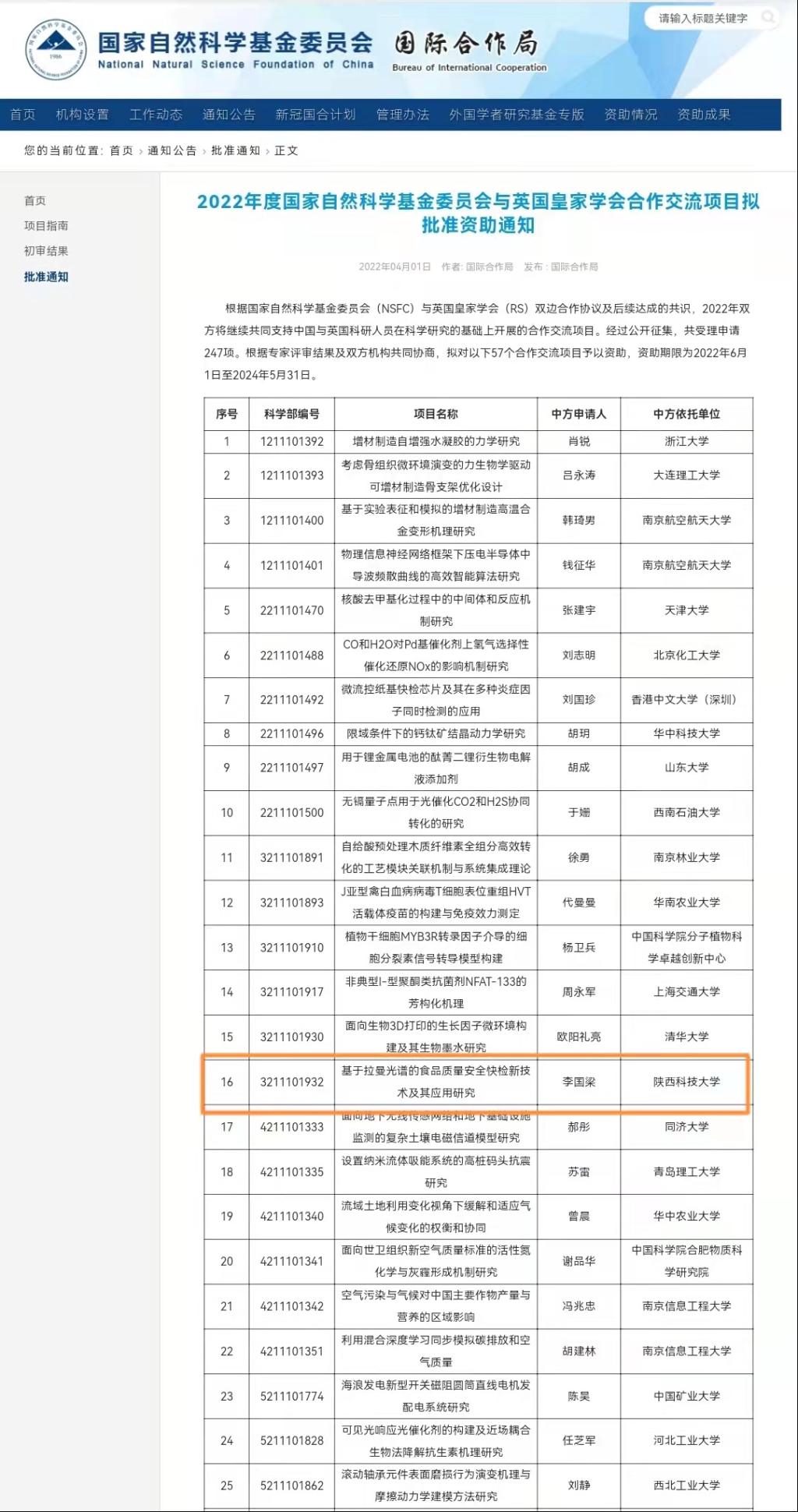食品科学与工程学院李国梁教授申报的“基于拉曼光谱的食品质量安全快检新技术及其应用研究”项目获得国家自然科学基金委员会与英国皇家学会合作交流项目资助。该类项目支持中国与英国科研人员在科学研究的基础上开展合作交流项目。2022年经公开征集,共受理申请247项,根据专家评审结果及双方机构共同协商,共资助57个合作交流项目,陕西省共有5个项目获得资助。