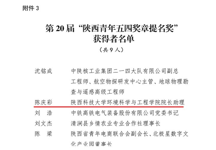 在建团百年之际,为充分发挥青年典型模范带头作用,激励全省广大青年心怀“国之大者”,奋勇建功立业,以优异成绩迎接党的二十大胜利召开,共青团陕西省委、陕西省青年联合会授予70名同志“陕西青年五四奖章”、25个青年集体“陕西青年五四奖章集体”、9名同志“陕西青年五四奖章提名奖”、10个青年集体“陕西青年五四奖章集体提名奖”,德赢官网环境科学与工程学院青年教师陈庆彩荣获第二十届“陕西青年五四奖章提名奖”。
