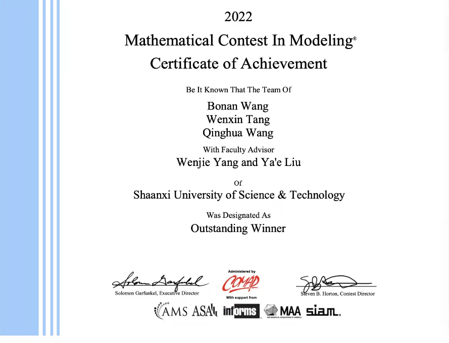 美国大学生数学建模竞赛(MCM/ICM),是一项世界范围内最具影响力的数学建模竞赛,为现今各类数学建模竞赛之鼻祖,每年参赛学校包括牛津大学、清华大学、北京大学、西安交通大学等知名高校。MCM/ICM是Mathematical Contest in Modeling和Interdisciplinary Contest in Modeling的缩写,即“数学建模竞赛”和“交叉学科建模竞赛”。MCM始于1985年,ICM始于2000年,由COMAP(美国数学及其应用联合会)主办。MCM/ICM着重强调研究问题、解决方案的原创性、团队合作、交流以及结果的合理性,要求参赛队伍在规定时间内对所选问题进行建模求解,并完成一份英文论文通过网络上传至主办方。比赛设有特等奖(Outstanding Winner,即O奖)、特等奖提名(Finalist,即F奖)、一等奖(Meritorious Winner,即M奖)、二等奖(Honorable Mention,即H奖)、三等奖(Successful Participant,即S奖)。