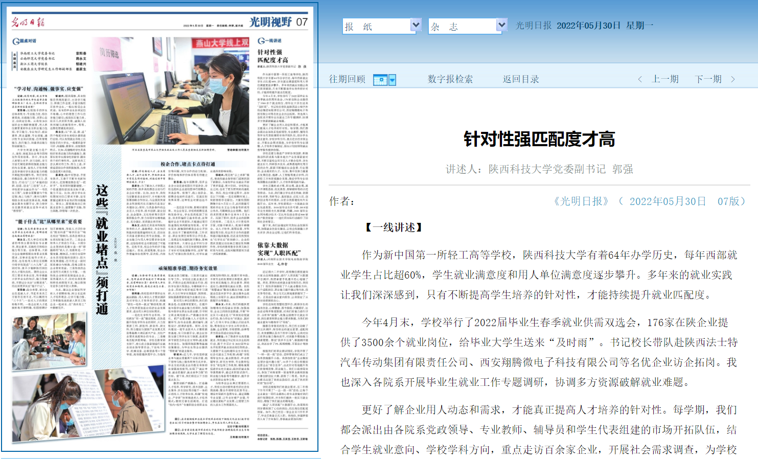5月30日,《光明日报》刊发了校党委副书记郭强讲述德赢官网就业工作的专访文章《针对性强匹配度才高》。