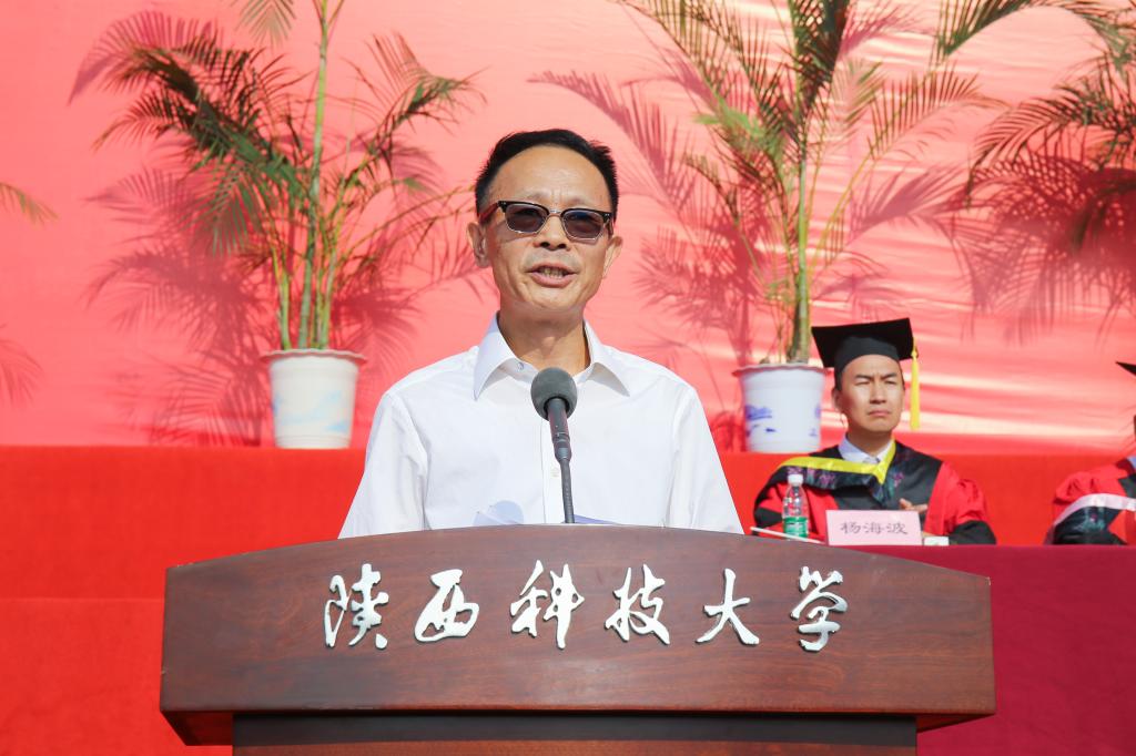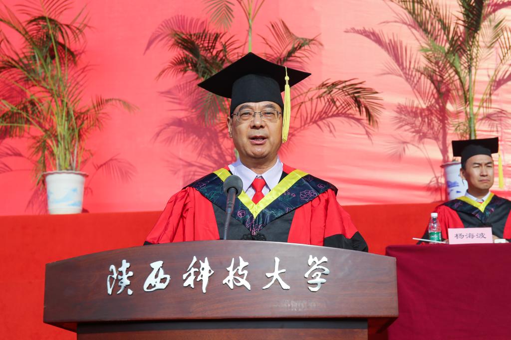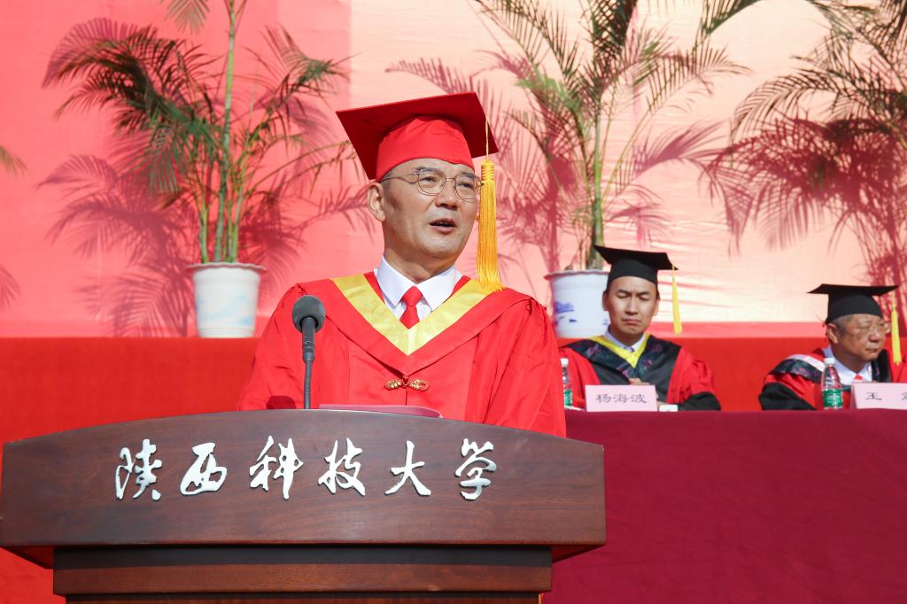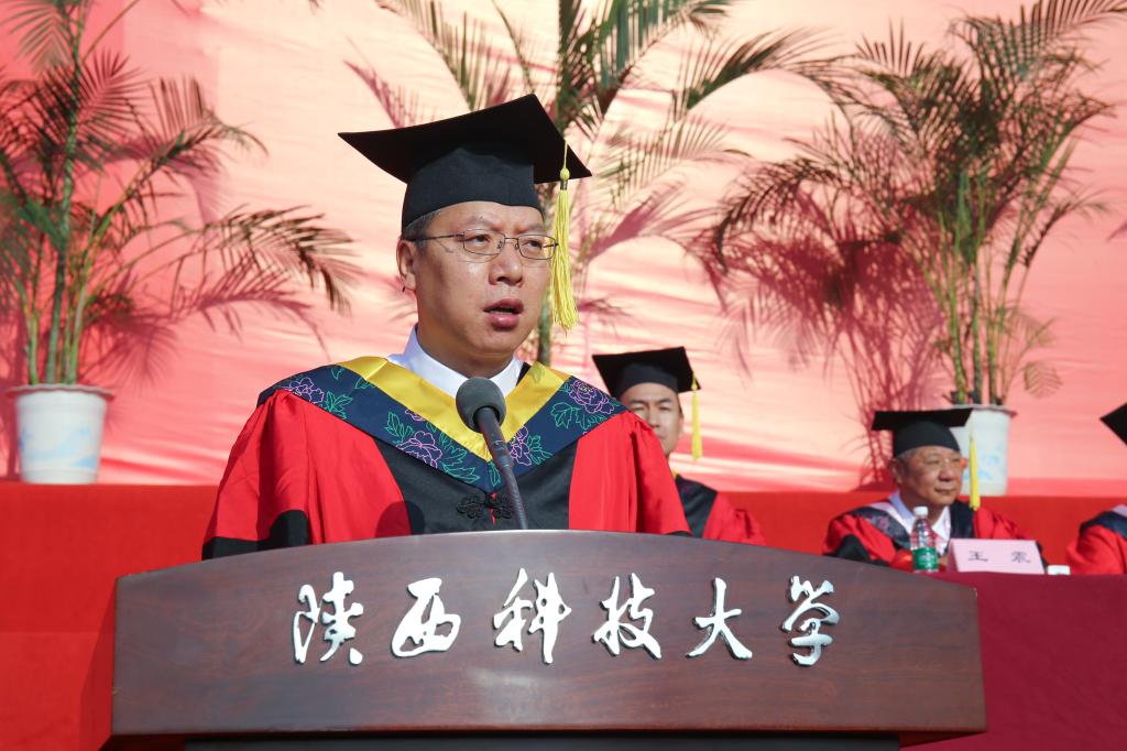 李志健代表学校向全体毕业生圆满完成学业表示热烈祝贺,向辛勤付出的全体教职员工和学生家长表示衷心感谢。他回顾了过去四年里国家面貌发生的深刻变化和学校取得的成就,全体陕科大人用勤劳和智慧取得了新增3个一级学科博士学位授权点、新增2个学科进入ESI全球前1%、技术成果转化率位列全国高校20强等突出成绩,他为同学们通过学习深造、投笔从戎、奔赴工作岗位等形式追求梦想、担负家国责任感到欣慰和自豪。