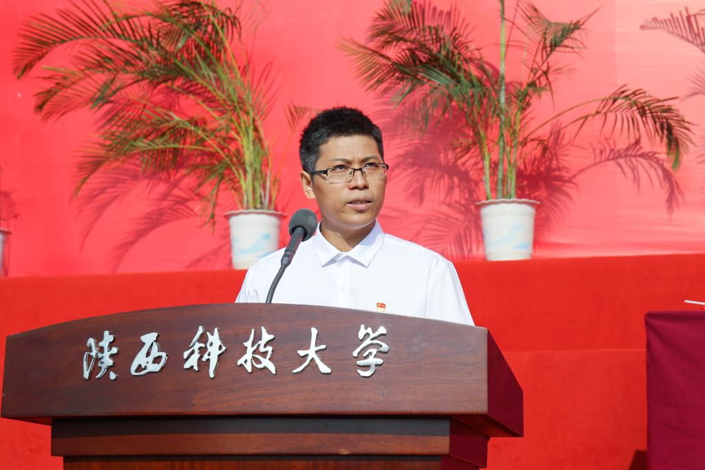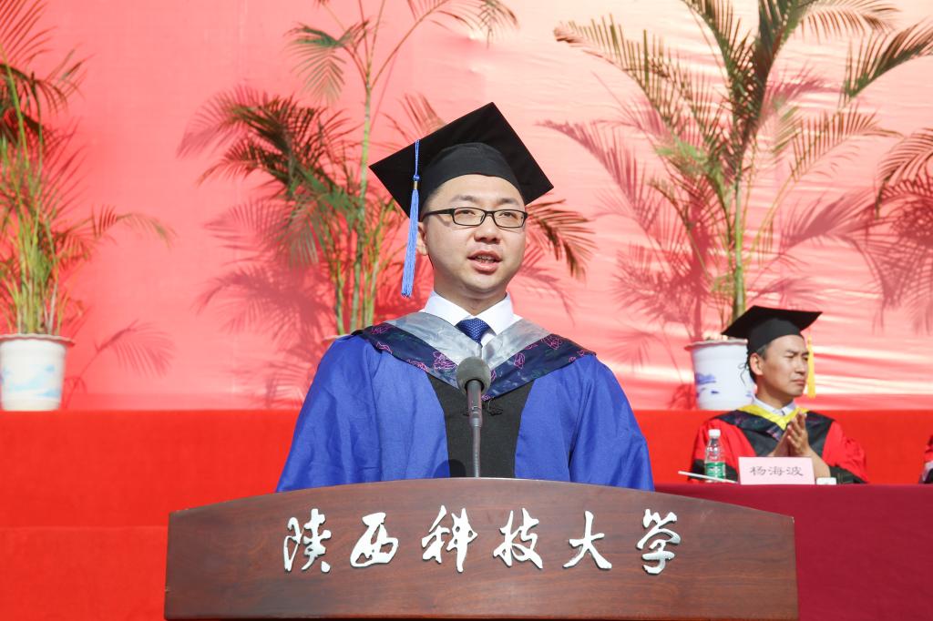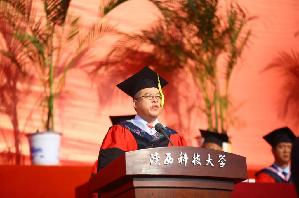 校友代表、西安金源电气股份有限公司董事长刘家兵在致辞中欢迎全体毕业生加入陕科大温暖的校友大家庭,寄语毕业生要终身学习、增长才干,努力工作、敢于担当,坚守理想、自强不息,在青春的赛道上奋力跑出精彩的华章!