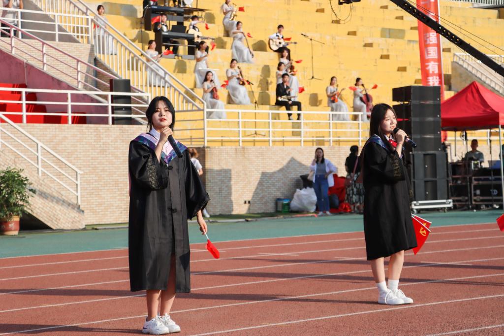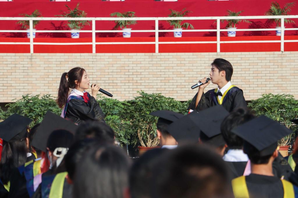 典礼开始前,与会校领导与即将毕业的研究生代表在网球场布设的“青春献礼二十大,强国有我新征程”桁架前合影留下珍贵的瞬间。在《起风了》《少年》等熟悉的旋律中,毕业生代表引吭高歌,抒发着阵阵离情别意。