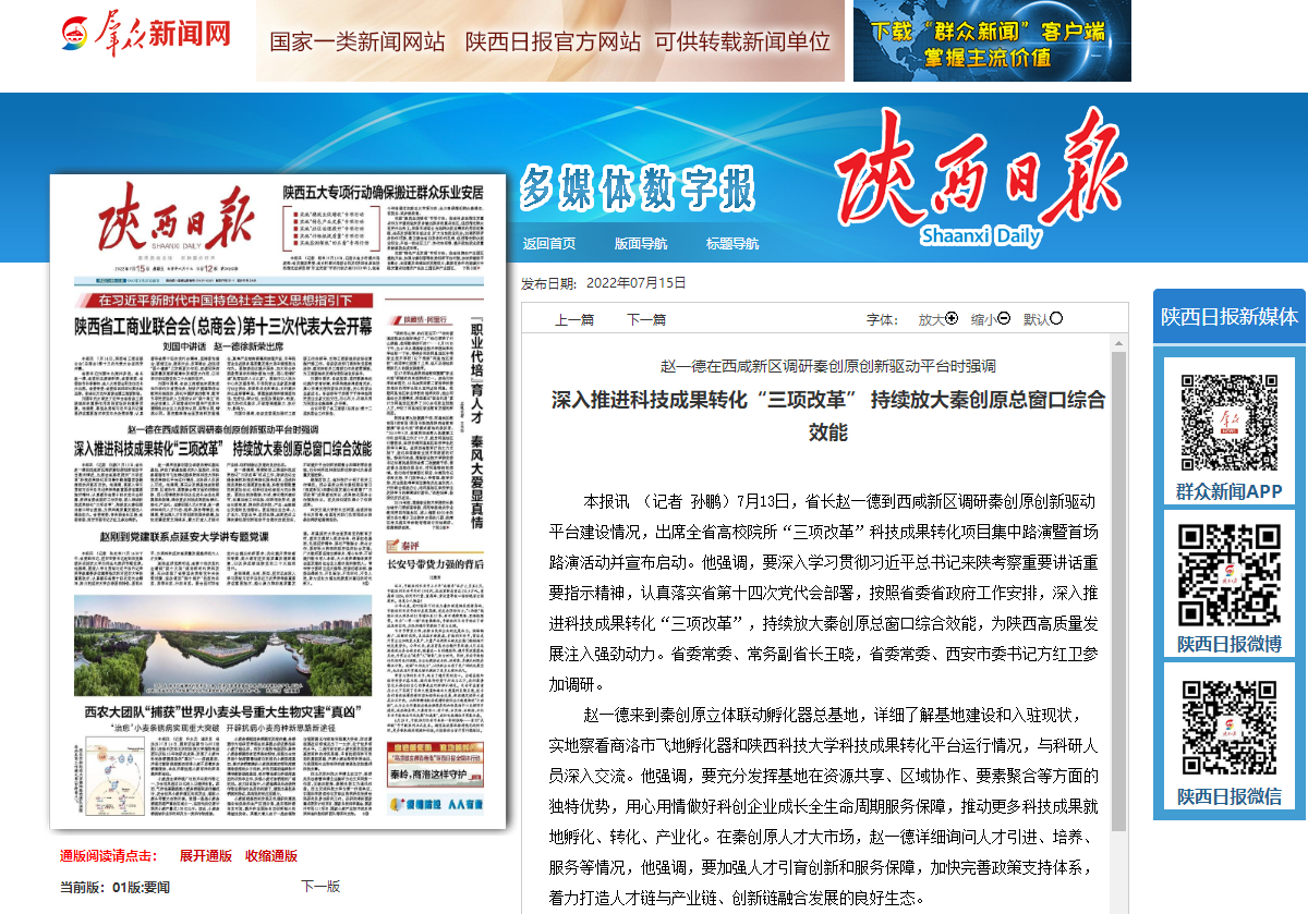 陕西日报:赵一德在西咸新区调研秦创原创新驱动平台时强调 深入推进科技成果转化“三项改革” 持续放大秦创原总窗口综合效能