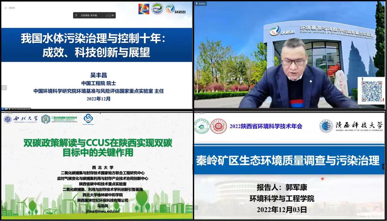吴丰昌院士、西北大学马劲风教授、德赢官网环境科学与工程学院郭军康教授等分别以“我国水体污染控制与治理十年:成效、科技支撑与展望”“双碳政策解读与CCUS在陕西实现双碳目标中的关键作用”“秦岭矿区生态环境质量调查与污染治理”为题作大会主旨报告。