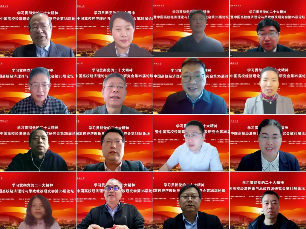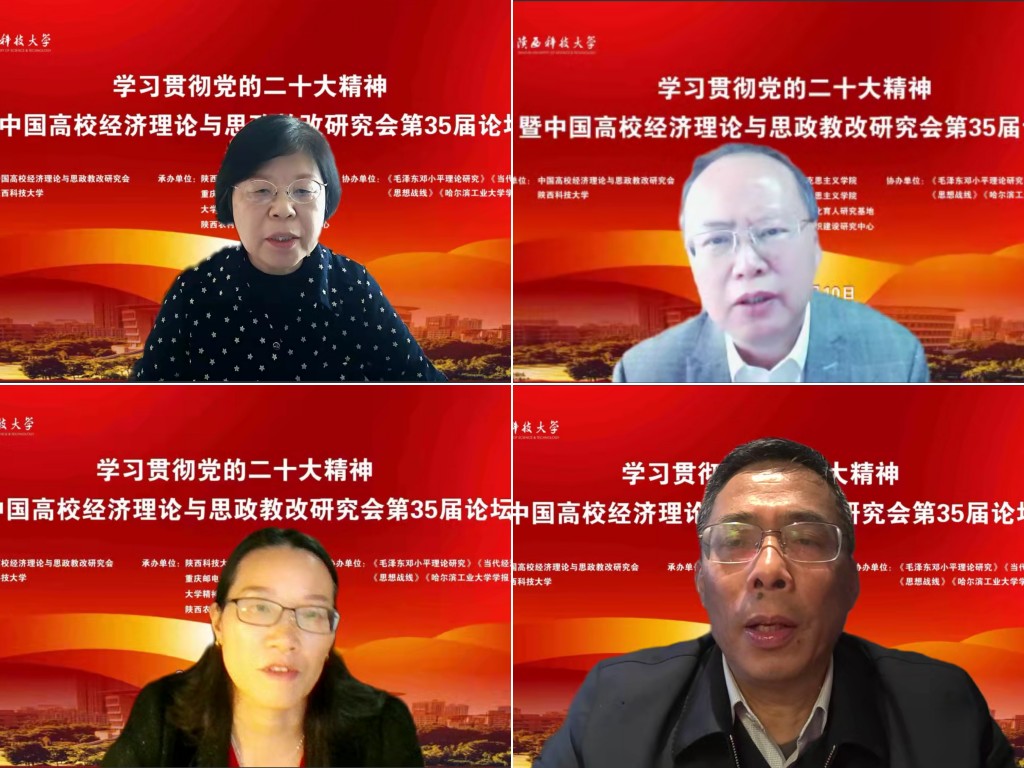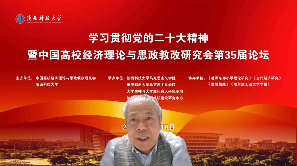 12月10日,由中国高校经济理论与思政教改研究会和德赢官网Vwin共同主办,重庆邮电大学马克思主义学院、大学精神与大学文化育人研究基地、陕西农村基层党组织建设研究中心联合承办的“学习贯彻党的二十大精神暨中国高校经济理论与思政改革研究会第35届论坛”成功举办。来自中国社会科学院、中央党校、上海社会科学院、中国人民大学、浙江大学、武汉大学、北京师范大学、上海交通大学、西安交通大学、哈尔滨工业大学、南开大学、兰州大学、中南大学、厦门大学、郑州大学、重庆大学、云南大学、南京师范大学、北京理工大学、西北农林科技大学、华中农业大学、西安电子科技大学、陕西师范大学、贵州师范大学、长安大学、西安石油大学、北京建筑大学、福州大学、浙江理工大学、重庆邮电大学、中国民航大学、西安建筑科技大学、西安科技大学、哈尔滨理工大学、山东青年政治学院等国内35所高校及研究机构和《马克思主义研究》《毛泽东邓小平理论研究》《当代经济研究》《思想战线》《青海社会科学》《贵州民族研究》《哈尔滨工业大学学报》等多家知名期刊的专家学者,聚焦“中国高校经济理论与思政改革”主题,展开深入研讨交流。