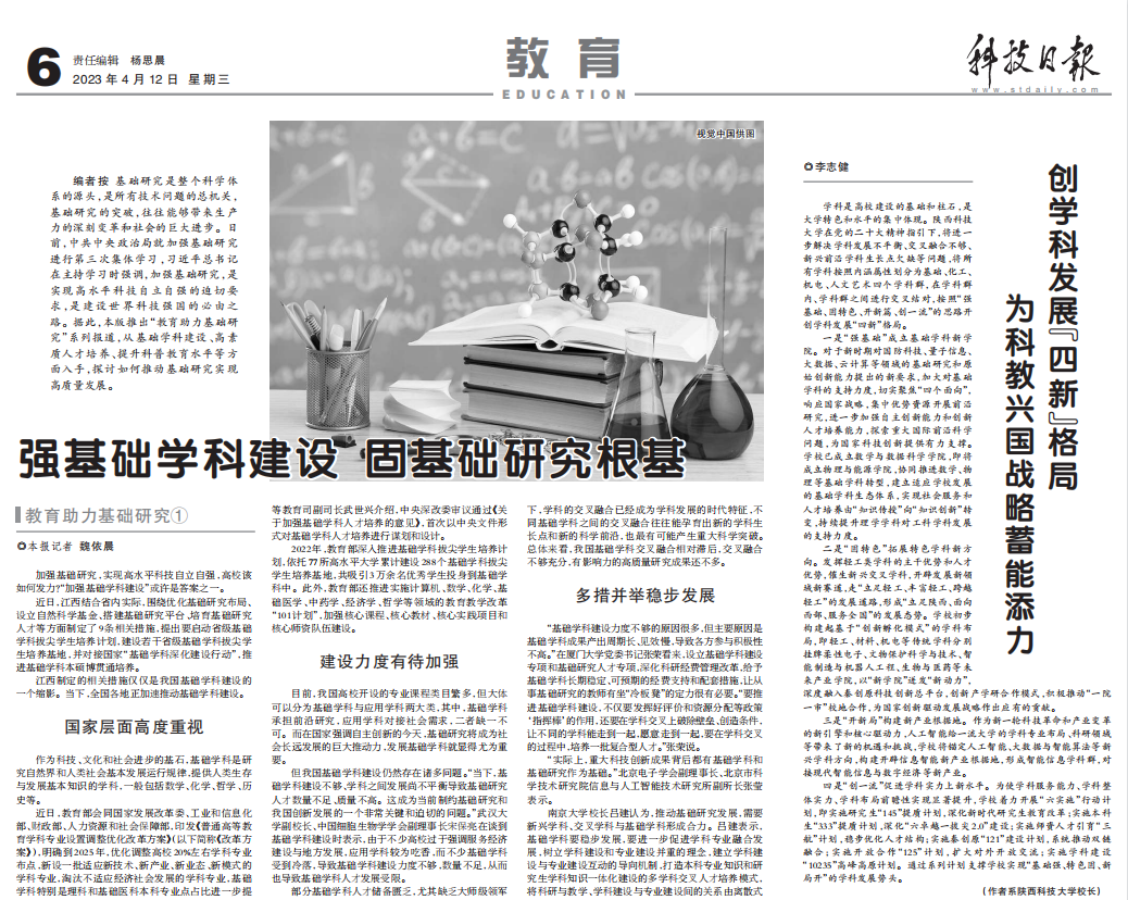 《科技日报》4月12日“教育版”刊发德赢官网校长李志健署名文章《创学科发展“四新”格局 为科教兴国战略蓄能添力》,文章写道:“学科是高校建设的基础和柱石,是大学特色和水平的集中体现。德赢官网Vwin在党的二十大精神指引下,将进一步解决学科发展不平衡、交叉融合不够、新兴前沿学科生长点欠缺等问题,将所有学科按照内涵属性划分为基础、化工、机电、人文艺术四个学科群,在学科群内、学科群之间进行交叉结对,按照‘强基础、固特色、开新篇、创一流’的思路开创学科发展‘四新’格局。”