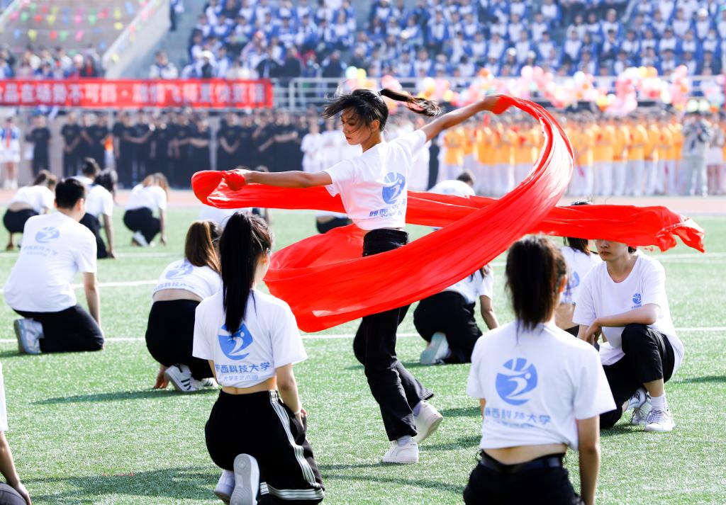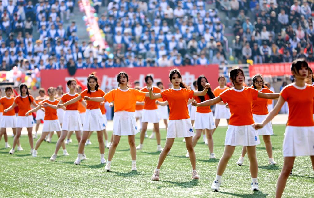大学生表演的大型团体操《逐梦中国风》《中华武魂》《赤心跃万疆》《青春·活力》热情激昂、活力四射,悦动的旋律和动感的舞步完美结合,精彩的表演赢得阵阵掌声和喝彩。