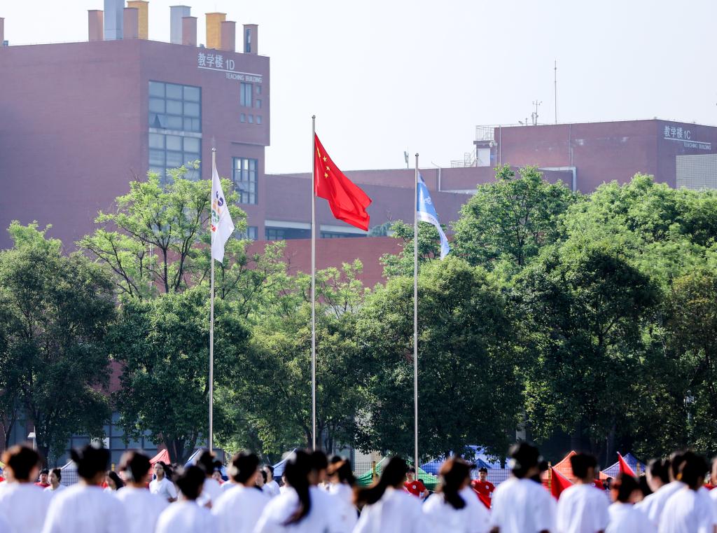 随后,在雄壮的国歌声和校歌声中,五星红旗、校旗和运动会会旗相继冉冉升起。