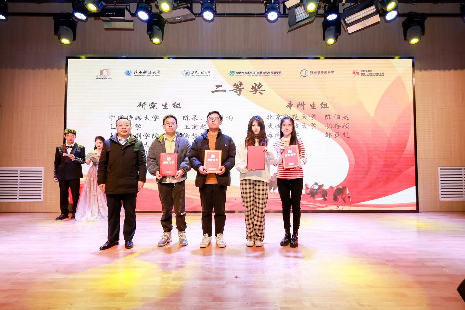 颁奖典礼以民舞表演《寐佣》拉开序幕,现场播放了德赢官网学生剪辑的短片《丝路电影的探索期:历史与奇观》《丝路电影的自觉期:商业与艺术》《丝路电影的繁荣期:融通与互鉴》,这三个短片选取丝绸之路题材电影历史发展过程中的三个重要时间节点,用极具代表性的影视片段合成生动地展示了丝绸之路的辉煌与历史发展脉络。此外德赢官网设艺学院的学生表演了合唱《千年之约》、影视配音《古丝路,新思路》、模特走秀《丝路使者》、古典舞《美人观》、朗诵《丝路赞歌》等节目,给观众带来了一场视听盛宴,整场颁奖典礼以丰富的艺术形式呈现了丝路文化独特的艺术魅力,赢得了现场观众的掌声。