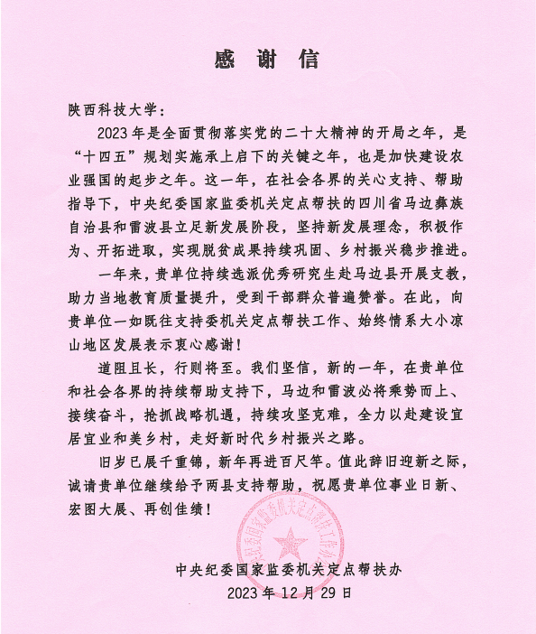 感谢信中写到:“一年来,贵单位持续选派优秀研究生赴马边县开展支教,助力当地教育质量提升,受到干部群众普遍赞誉。在此,向贵单位一如既往支持委机关定点帮扶工作、始终情系大小凉山地区发展表示衷心感谢!道阻且长,行则将至。我们坚信,新的一年,在贵单位和社会各界的持续帮助支持下,马边和雷波必将乘势而上、持续奋斗,抢抓战略机遇,持续攻坚克难,全力以赴建设宜居宜业和美乡村,走好新时代乡村振兴之路。”