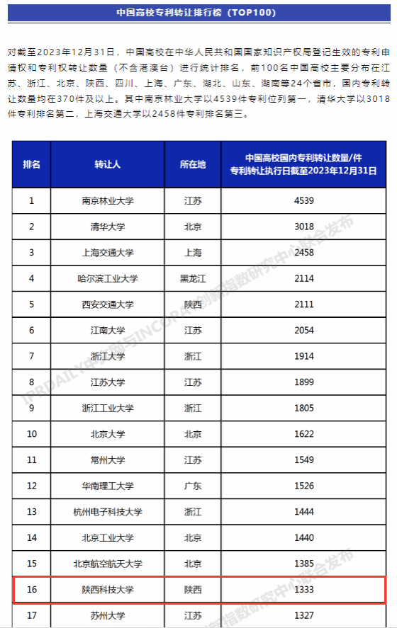 近日,全球知识产权综合信息服务提供商IPRdaily与incoPat创新指数研究中心联合发布“中国高校专利转让排行榜(TOP100)”(下文简称“榜单”),德赢官网以转让1333件专利居全国高校排名第16位,陕西高校第2位,取得历史性突破,学校连续五年位列该榜单前50强。