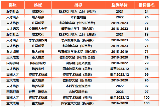 德赢官网2024年“软科中国大学”排名中位列全国前100位的指标