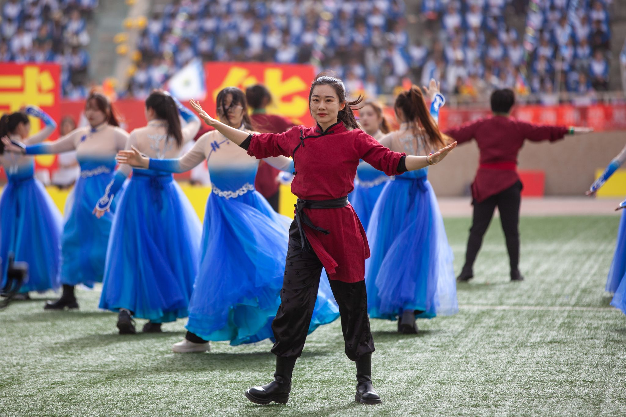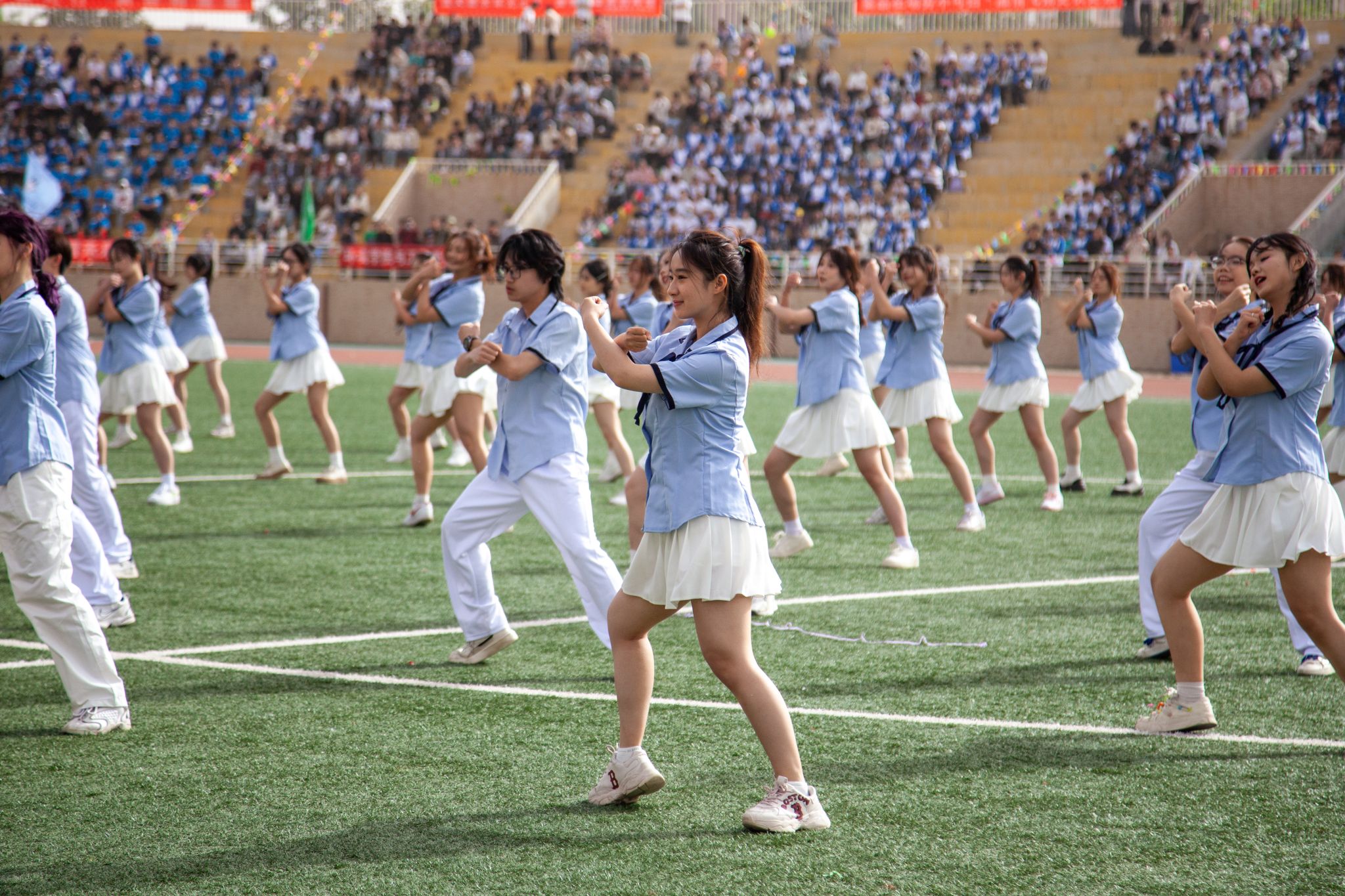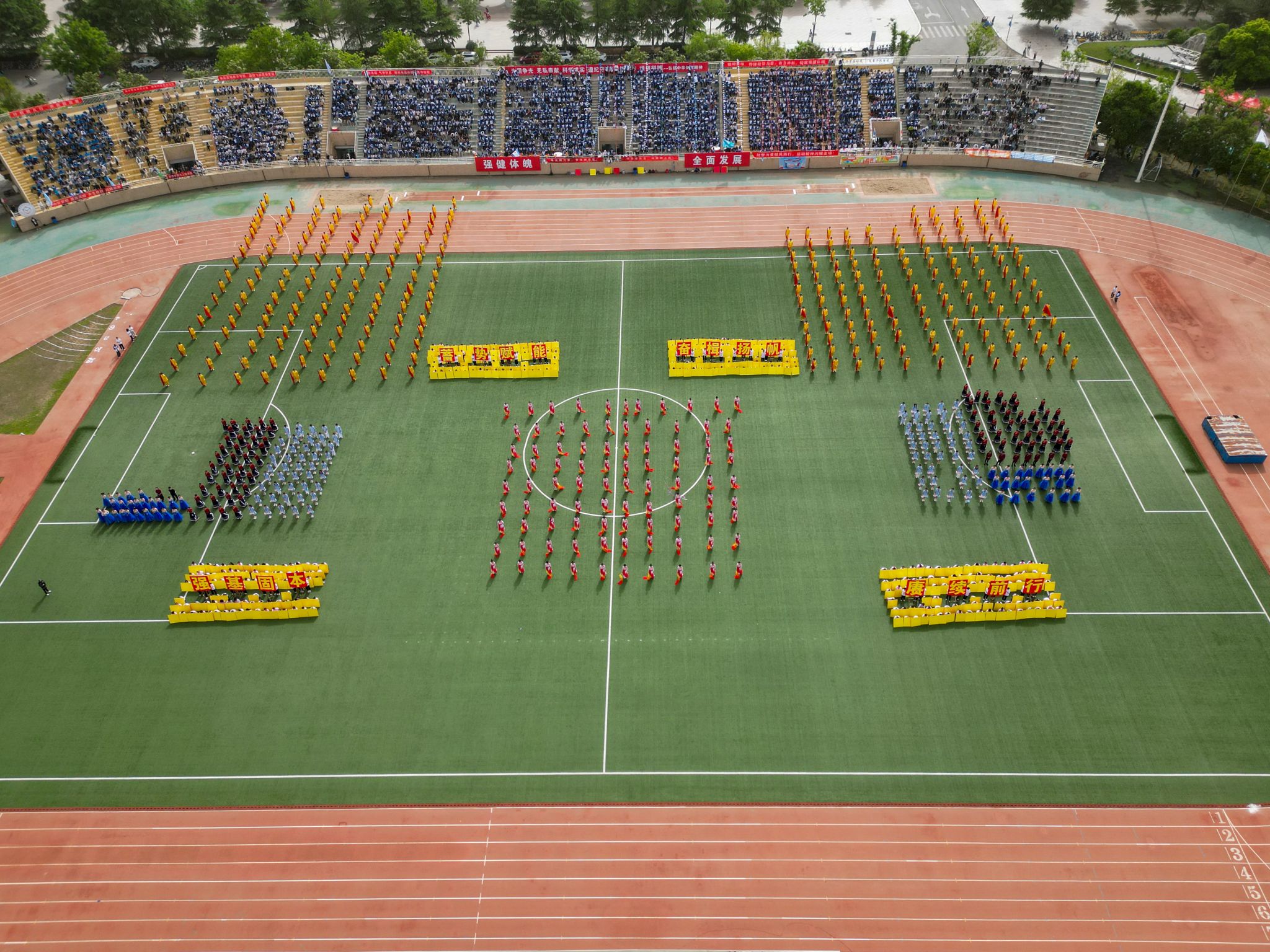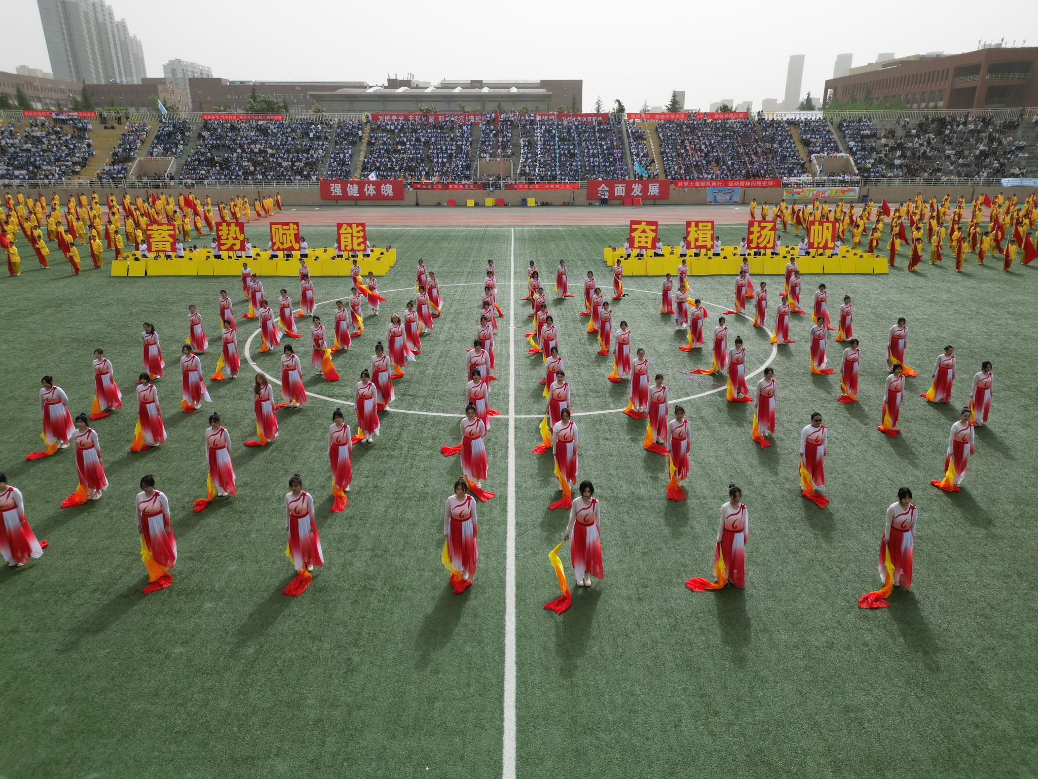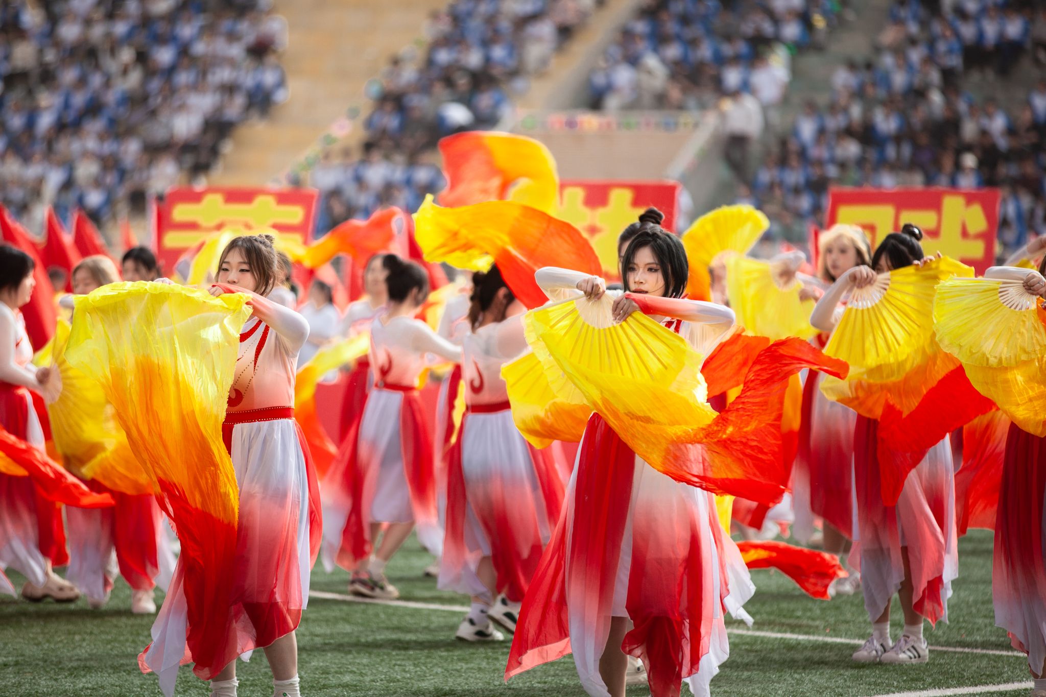 战旗迎风猎猎、扇舞红绸如火,大学生表演的大型团体操《青春科大》《旗武风云》《长绸扇舞》《民舞串烧》朝气蓬勃、活力四射,600余名学子以灿烂的笑容和优美的舞姿诠释着青春与活力,为学校2024年田径运动会起舞喝彩。