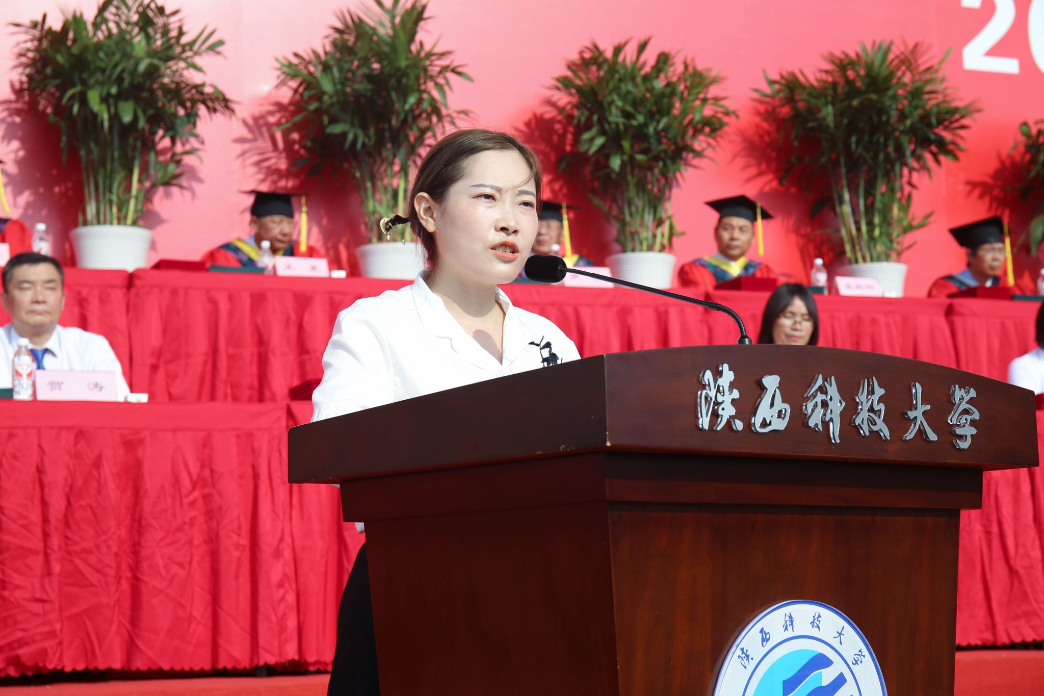 马克思主义学院教师李亚莉代表全校教师为毕业生送上真诚的祝福,希望同学们能始终保持对知识的热爱、对学习的渴望,始终与新时代同向同行,有恒心、守本心、给耐心,做到“仰不愧于天,俯不怍于人”,在未来的人生舞台上绽放绚丽之花。